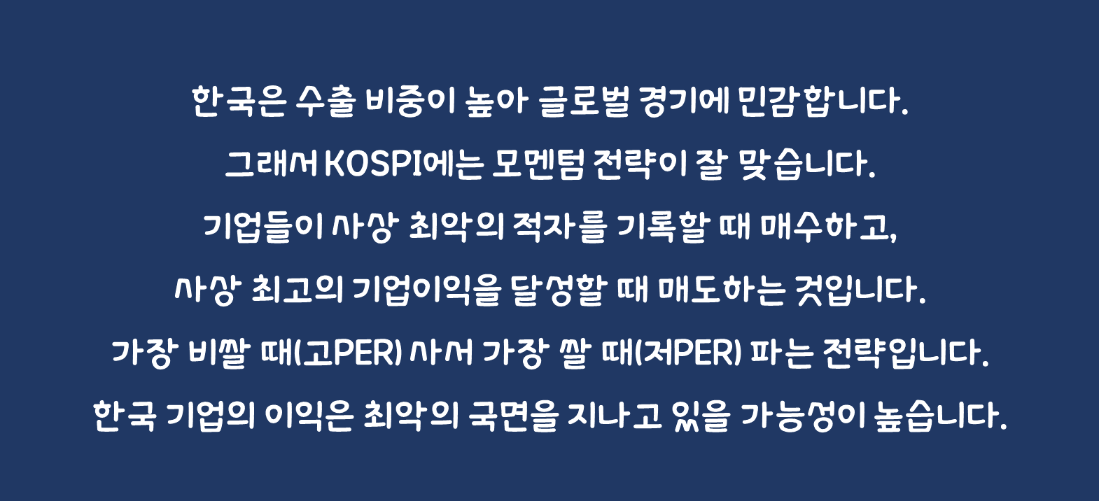 한국은 수출 비중이 높아 글로벌 경기에 민감합니다. 그래서 KOSPI에는 모멘텀 전략이 잘 맞습니다. 기업들이 사상 최악의 적자를 기록할 때 매수하고, 사상 최고의 기업이익을 달성할 때 매도하는 것입니다. 가장 비쌀 때(고PER) 사서 가장 쌀 때(저PER) 파는 전략입니다. 한국 기업의 이익은 최악의 국면을 지나고 있을 가능성이 높습니다.