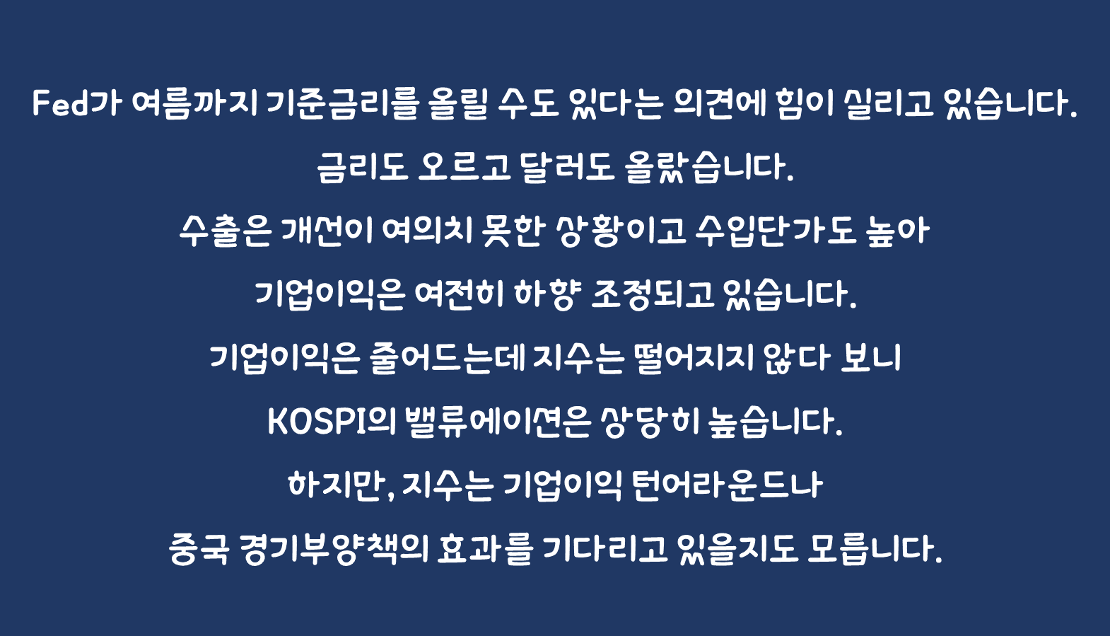 Fed가 여름까지 기준금리를 올릴 수도 있다는 의견에 힘이 실리고 있습니다. 금리도 오르고 달러도 올랐습니다. 수출은 개선이 여의치 못한 상황이고 수입단가도 높아 기업이익은 여전히 하향 조정되고 있습니다. 그럼에도 불구하고 KOSPI는 크게 떨어지기보다는 2,200~2,500P 박스권 상단에서 몇 주째 머물고 있습니다. 기업이익은 줄어드는데 지수는 떨어지지 않다 보니 KOSPI의 밸류에이션은 상당히 높습니다.
