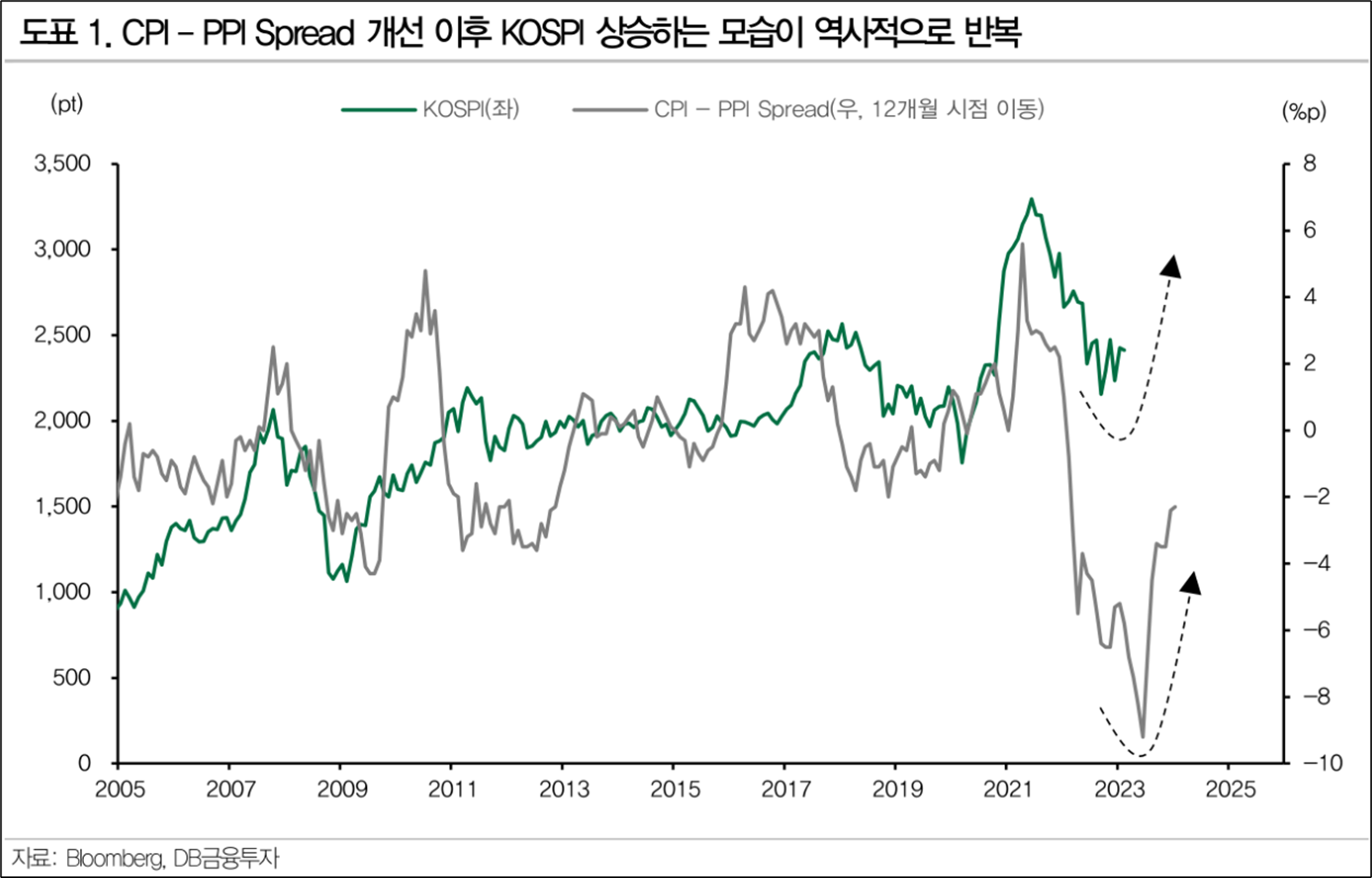 기업의 입장에서 소비자물가는 판가, 생산자물가는 원가로 볼 수 있다. 여기서 판가와 원가의 차이가 확대된다면 기업이익이 개선되는 것은 당연하다. 현재도 이와 같은 현상이 진행되고 있다. 글로벌 전반으로 물가상승률이 낮아지는 것과 더불어 CPI 상승률 대비하여 PPI 상승률이 둔화하고 있다. 이에 따라 'CPI(%YoY) - PPI(%YoY) Spread'가 개선되고 있다. 과거 사례를 보면 이러한 거시적 현상이 진행된 이후 일정한 시차를 두고 개별 기업의 이익 증가 가능성을 투영하며 주식시장이 상승했다. 현재도 이와 같은 현상을 기대해볼 수 있는 것이다.