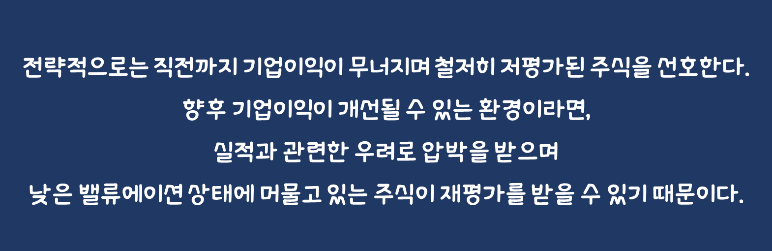 전략적으로는 직전까지 기업이익이 무너지며 철저히 저평가된 주식을 선호한다. 향후 기업이익이 개선될 수 있는 환경이라면, 실적과 관련한 우려로 압박을 받으며 낮은 밸류에이션 상태에 머물고 있는 주식이 재평가를 받을 수 있기 때문이다. 이점이 당사가 최근 여러 자료를 통하여 딥밸류 가치주를 추천하는 이유다.