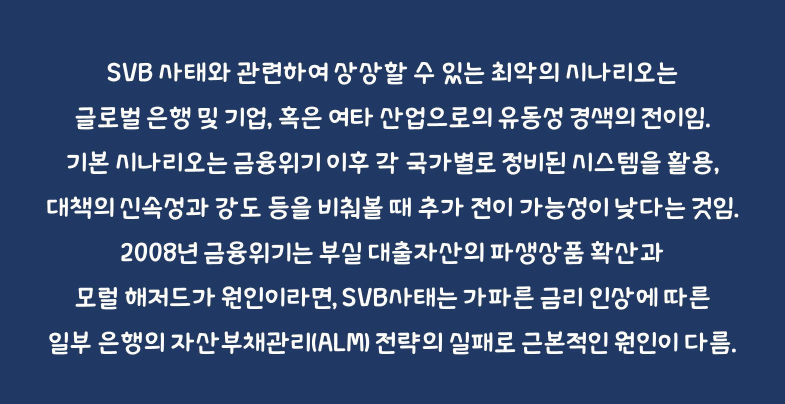 SVB 사태와 관련하여 상상할 수 있는 최악의 시나리오는 글로벌 은행 및 기업, 혹은 여타 산업으로의 유동성 경색의 전이임. 뱅크런 추가 확대→미국 중소 은행 추가 파산→유럽 중소 은행 및 크레디트스위스은행 파산→소프트뱅크 디폴트 선언→미 테크 및 유니콘 기업 디폴트⋯ →미 상업용 부동산 관련 산업으로 유동성 경색 재확산 등.
