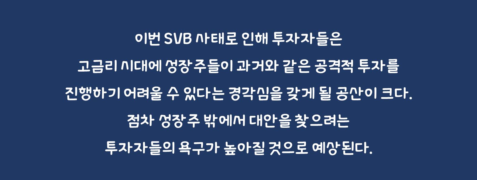고금리 환경에서도 투자자들이 성장주 압축전략을 추구하고 있다는 것이다. 하지만 이번 SVB 사태로 인해 투자자들은 고금리 시대에 성장주들이 과거와 같은 공격적 투자를 진행하기 어려울 수 있다는 경각심을 갖게 될 공산이 크다. 점차 성장주 밖에서 대안을 찾으려는 투자자들의 욕구가 높아질 것으로 예상된다.