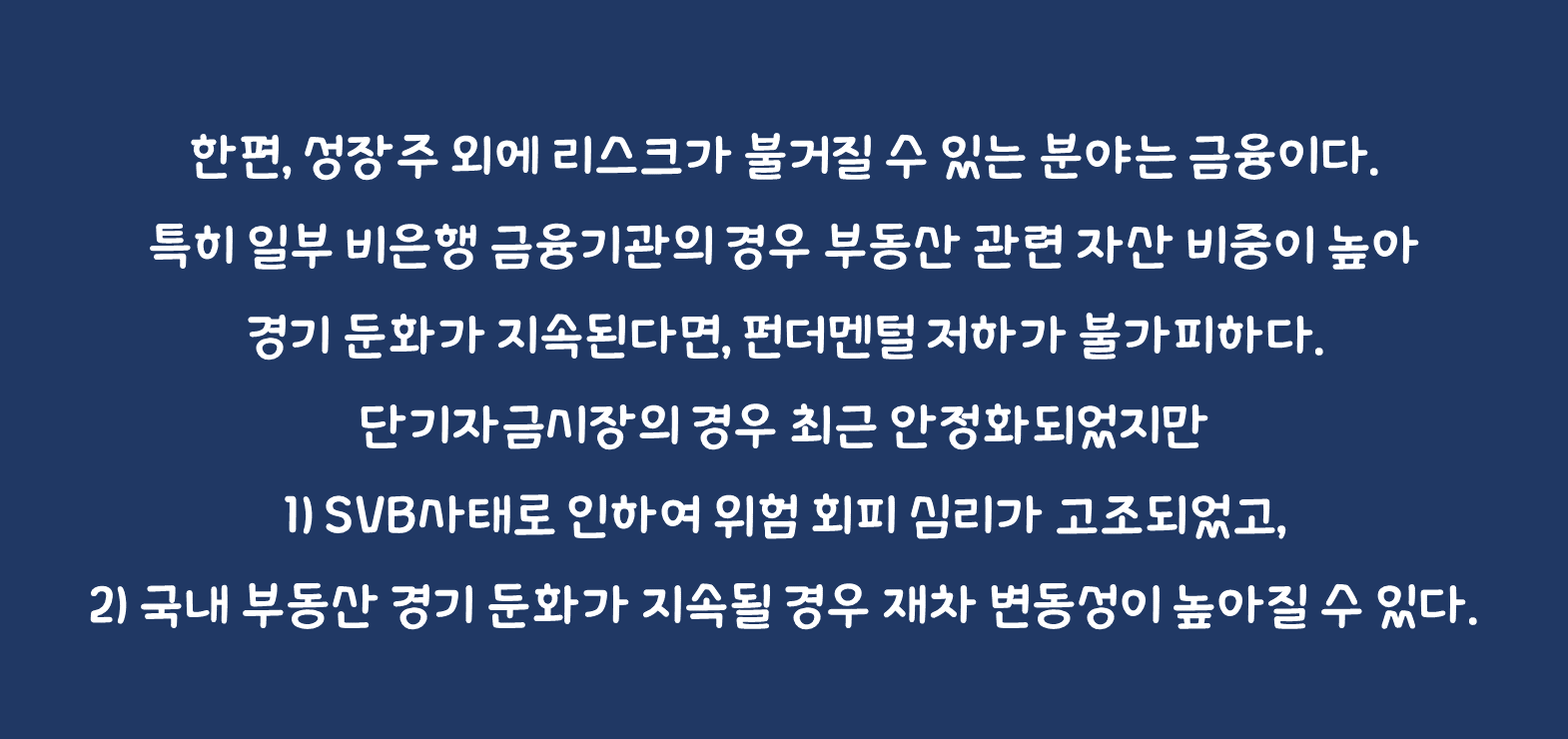 한편, 성장주 외에 리스크가 불거질 수 있는 분야는 금융이다. SVB 사태가 실리콘밸리를 넘어 유럽 은행주 관련 투자심리 위축으로 연결되는 양상인데, 한국 또한 이러한 여파가 발생할 수 있음을 주의할 필요가 있다.
