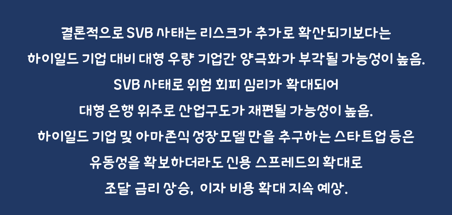 결론적으로 SVB 사태는 리스크가 추가로 확산되기보다는 하이일드 기업 대비 대형 우량 기업간 양극화가 부각될 가능성이 높음.