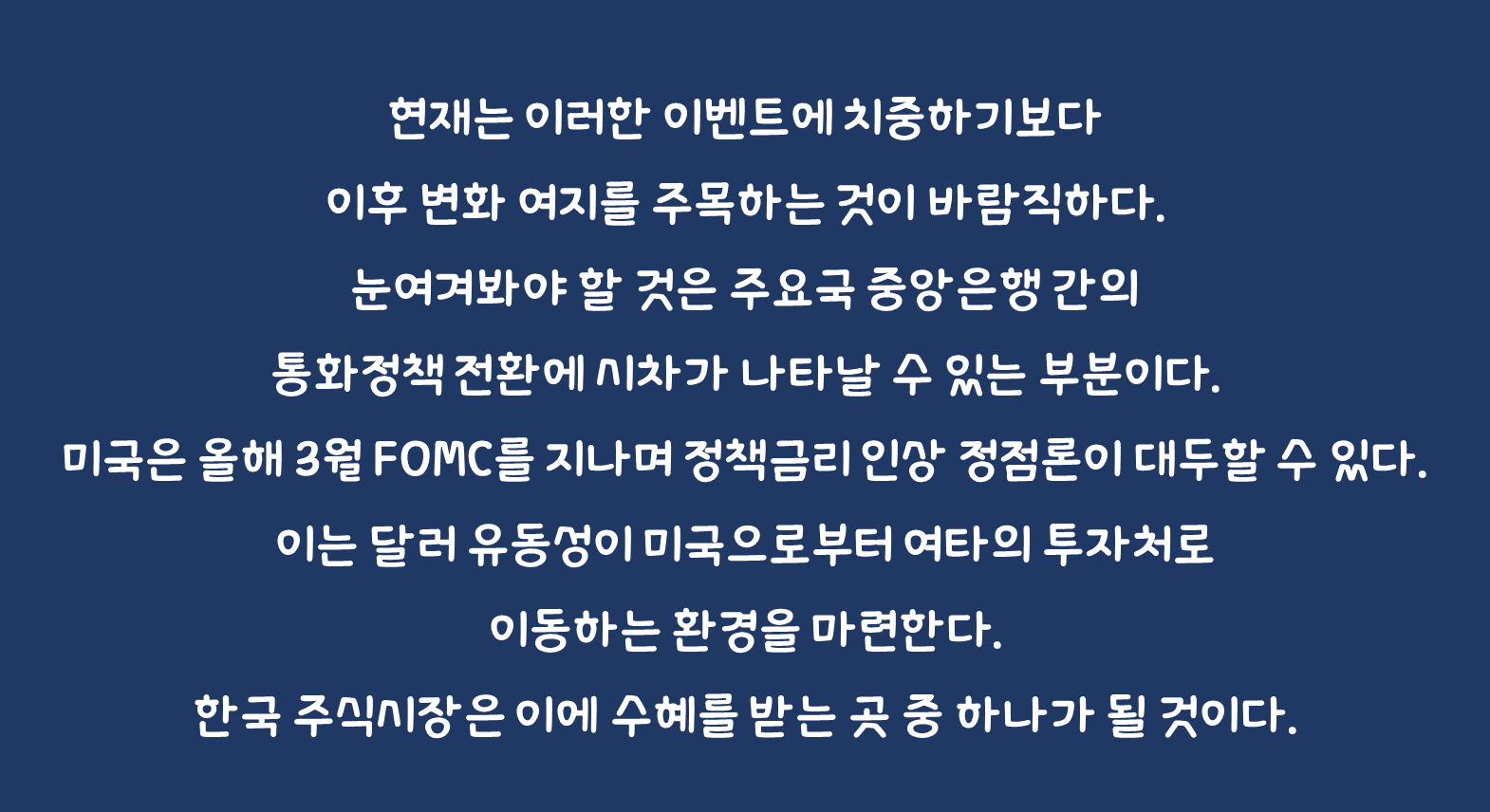 현재는 이러한 이벤트에 치중하기보다 이후 변화 여지를 주목하는 것이 바람직하다. 눈여겨봐야 할 것은 주요국 중앙은행 간의 통화정책 전환에 시차가 나타날 수 있는 부분이다. 미국은 올해 3월 FOMC를 지나며 정책금리 인상 정점론이 대두할 수 있다. 그들은 물가상승률이 내려오며 디스 인플레이션으로 나아가고 있기 때문이다(미국 2월 CPI 6%YoY), 반면, 유럽은 긴축적 통화정책을 유지할 수 있다. 이곳의 인플레이션은 아직 잡히지 않았기 때문이다(유로존 2월 CPI 8.5%YoY), 긴축 스탠스를 유지하는곳의 통화 가치가 상대적으로 높아진다는 점에서 보면, 유로화 강세에 의한 달러 약세의 가능성이 존재한다. 이는 달러 유동성이 미국으로부터 여타의 투자처로 이동하는 환경을 마련한다. 한국 주식시장은 이에 수혜를 받는 곳 중 하나가 될 것이다.