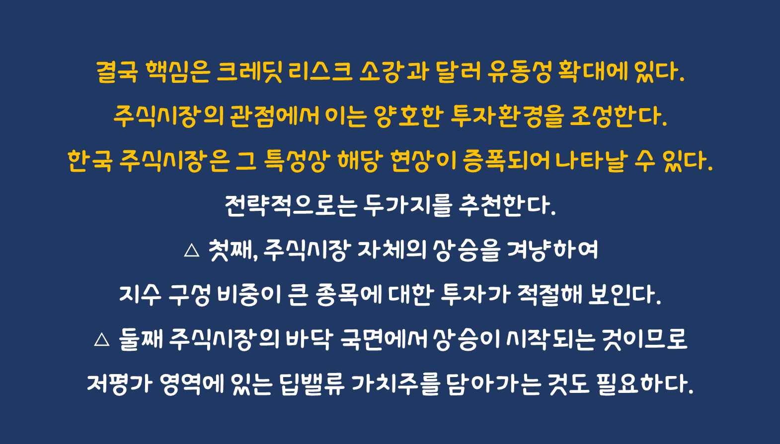 결국 핵심은 크레딧 리스크 소강과 달러 유동성 확대에 있다. 주식시장의 관점에서 이는 양호한 투자환경을 조성한다. 한국 주식시장은 그 특성상 해당 현상이 증폭되어 나타날 수 있다. 전략적으로는 두가지를 추천한다. △ 첫째, 주식시장 자체의 상승을 겨냥하여 지수 구성 비중이 큰 종목에 대한 투자가 적절해 보인다. △ 둘째 주식시장의 바닥 국면에서 상승이 시작되는 것이므로 저평가 영역에 있는 딥밸류 가치주를 담아가는 것도 필요하다.