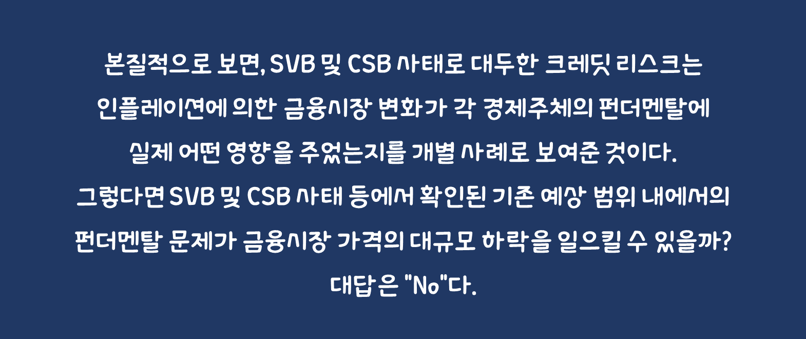 최근 발생한 SVB(실리콘밸리은행) 및 CSB(크레딧스위스은행) 사태 등에 대하여 바퀴벌레 효과를 거론하며 향후 금융시장의 가격 하락이 거칠게 나타날 수 있다는 우려가 존재한다. 하나둘씩 일어나는 뱅크런은 우리가 짐작하지 못했던 파괴적인 문제가 표면화되는 것이라고 일부에서는 말한다. 하지만 SVB 및 CSB 사태 등에서 드러난 펀더멘탈의 부진에 대해서 이미 지난 15년 동안 금융시장이 포괄적으로 예상하여 가격에 반영했을 수 있다. 신성장 산업 분야의 후퇴와 더불어 이에 따른 아케고스 등 투자기관의 실패는 모두가 알고 있던 바이다. 미국 국채의 가격 하락에 의한 초 안전자산의 안정성 붕괴도 시장 참여자들이 주지한 사실이다. 좀 더 간단하게는 이 모든 것이 인플레이션에 따른 금융시장의 변화였다. 바로 이점이 SVB 및 CSB 사태 등의 저변에 위치한다. 그리고 해당 현상은 2021년부터 2022년까지 금융시장의 가격 하락으로 투영됐다. 본질적으로 보면, SVB 및 CSB 사태로 대두한 크레딧 리스크는 인플레이션에 의한 금융시장 변화가 각 경제주체의 펀더멘탈에 실제 어떤 영향을 주었는지를 개별 사례로 보여준 것이다. 그렇다면 SVB 및 CSB 사태 등에서 확인된 기존 예상 범위 내에서의 펀더멘탈 문제가 금융시장 가격의 대규모 하락을 일으킬 수 있을까? 대답은 "No"다.