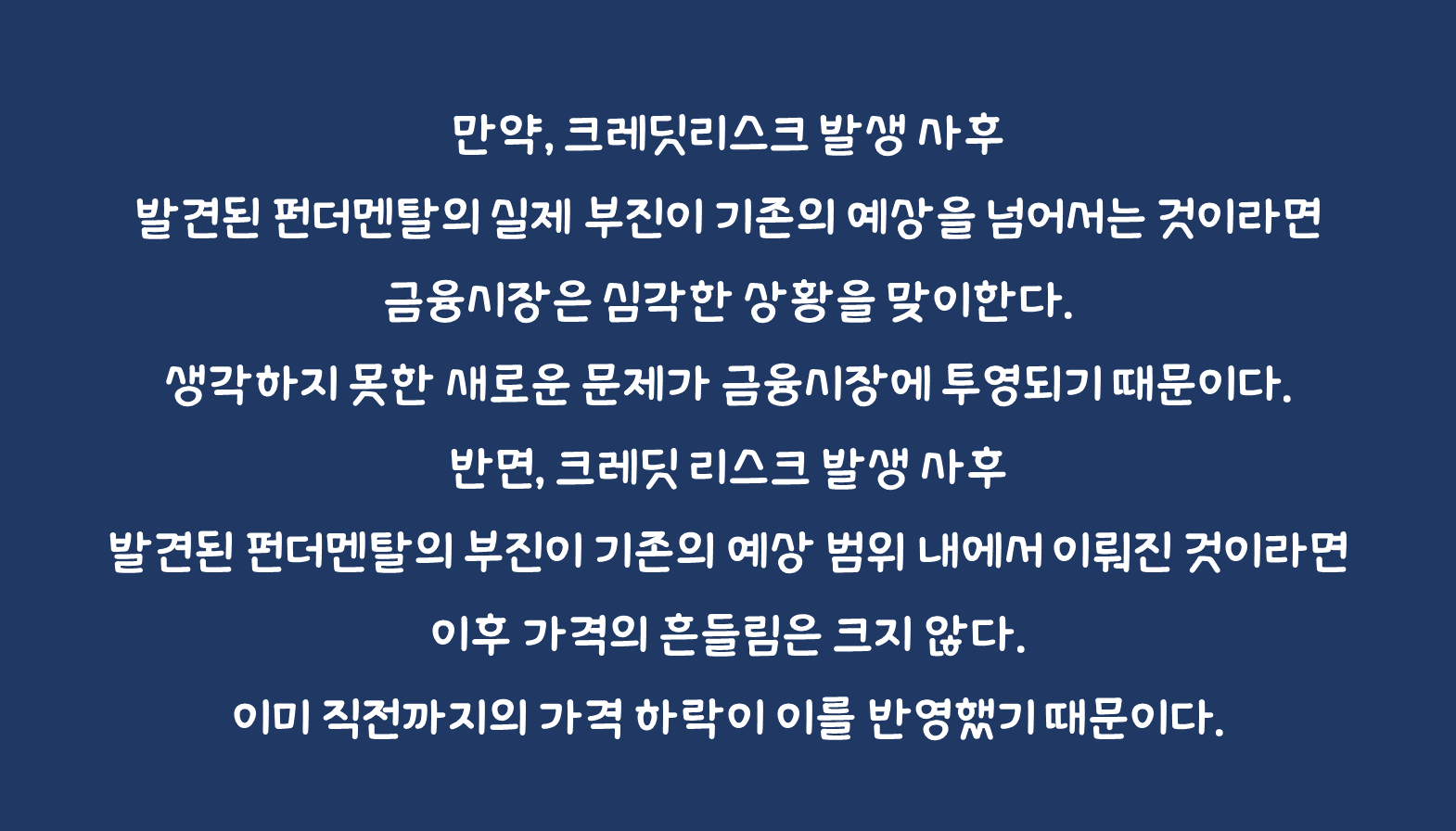금융시장의 가격 관점에서 크레딧 리스크는 다음과 같이 설명할 수 있다. “(크레딧 리스크 발생) 사전에 시장 참여자들이 잠재된 문제를 포괄적으로 예상하여 가격이 하락한 이후 (크레딧 리스크 발생) 사후 펀더멘탈의 부진이 실제로 확인되며 한 번 더 가격이 흔들리는 현상이다" △ 만약, 크레딧리스크 발생 사후 발견된 펀더멘탈의 실제 부진이 기존의 예상을 넘어서는 것이라면 금융시장은 심각한 상황을 맞이한다. 직전까지 나타난 가격 하락을 넘어 더 큰 하락이 이후로 진행되는 것이다. 생각하지 못한 새로운 문제가 금융시장에 투영되기 때문이다. △ 반면, 크레딧 리스크 발생 사후 발견된 펀더멘탈의 부진이 기존의 예상 범위 내에서 이뤄진 것이라면 이후 가격의 흔들림은 크지 않다. 이미 직전까지의 가격 하락이 이를 반영했기 때문이다.