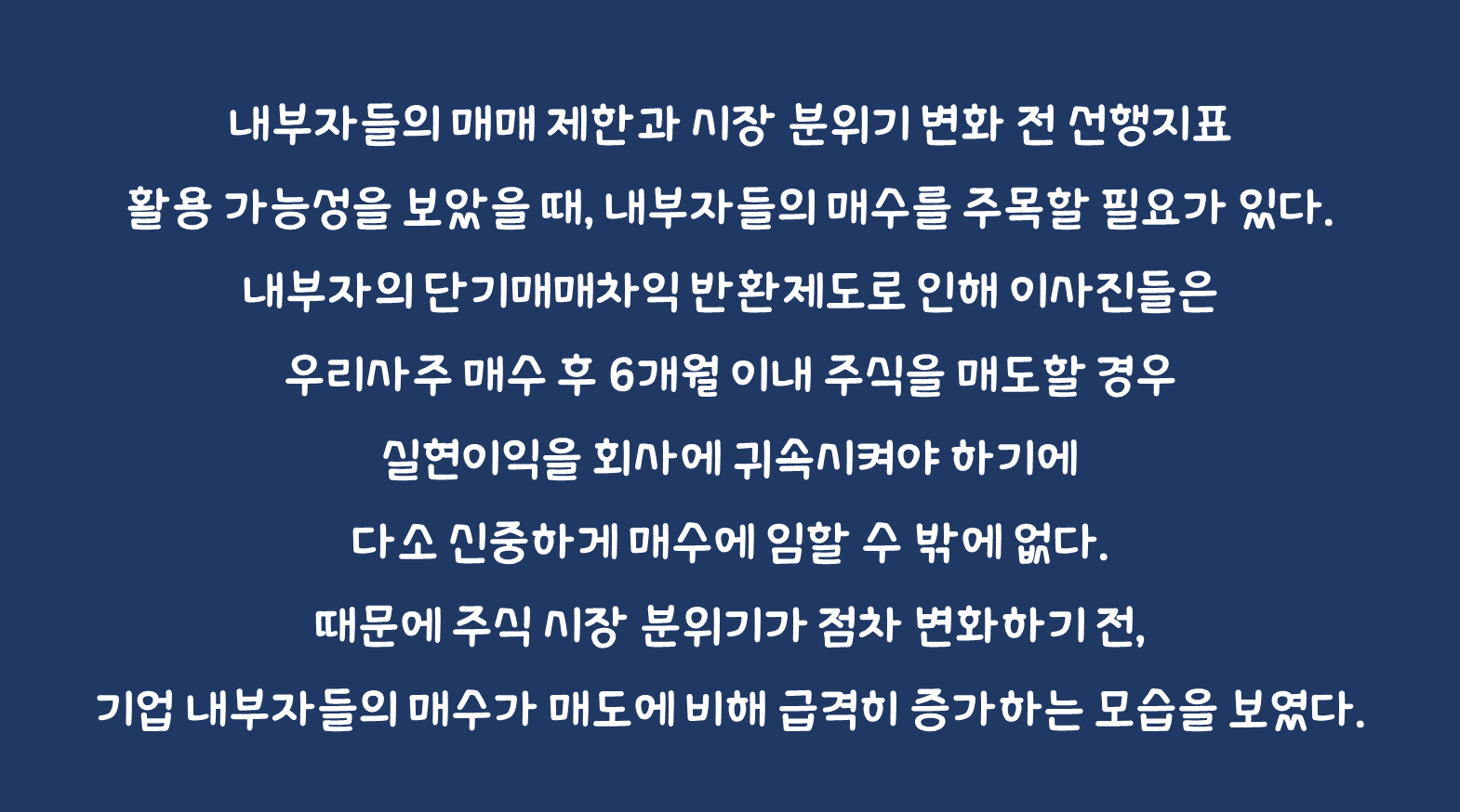 우리사주 거래 중 매수 확대를 주목해야 하는 이유: 내부자들의 매매 제한과 시장 분위기 변화 전 선행지표 활용 가능성을 보았을 때, 내부자들의 매수를 주목할 필요가 있다. 피터 린치는 내부자들의 매도는 여러가지 이슈에 의해서 발생할 수 있지만 매수는 중장기적 주가 상승을 기대하는 이유에서 만발생한다고 주장한다. 내부자의 단기매매차익 반환제도로 인해 이사진들은 우리사주 매수 후 6개월 이내 주식을 매도할 경우 실현이익을 회사에 귀속시켜야 하기에 다소 신중하게 매수에 임할 수 밖에 없다. 때문에 주식 시장 분위기가 점차 변화하기 전, 기업 내부자들의 매수가 매도에 비해 급격히 증가하는 모습을 보였다.
