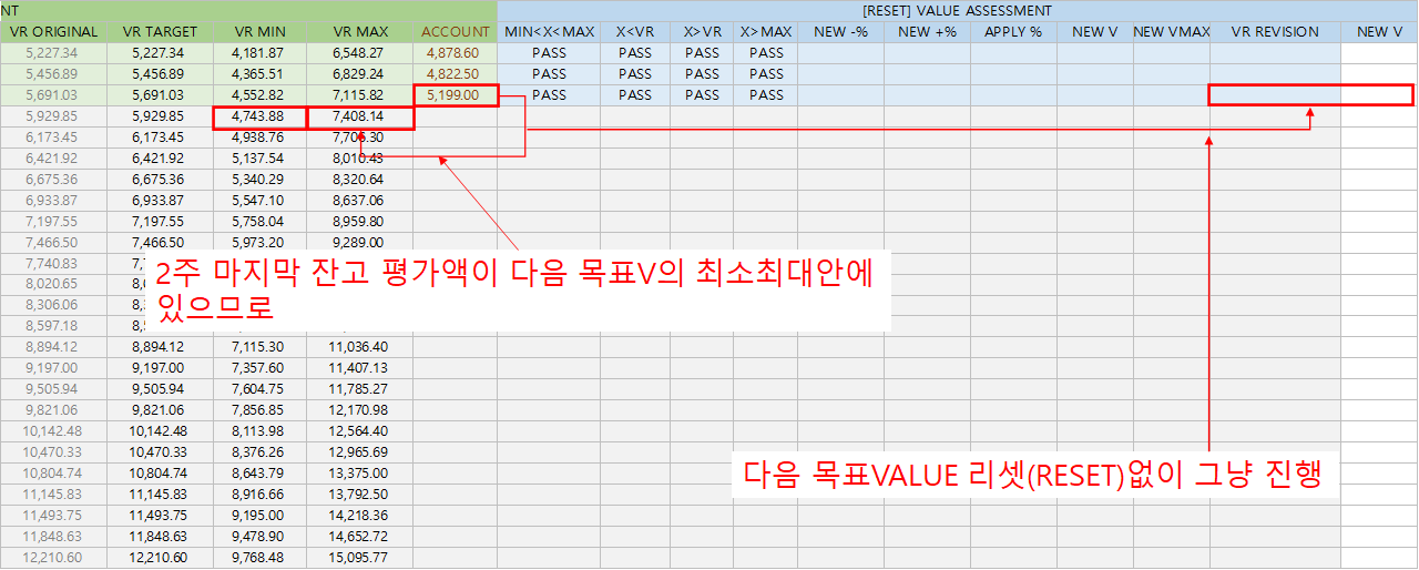 4) 2주 마지막 금요일의 평가금이 다음 목표 Value의 최소 최대 안에 위치하므로 다음 목표 Value의 재조종(RESET) 없이 다음 주차로 진행하겠습니다.