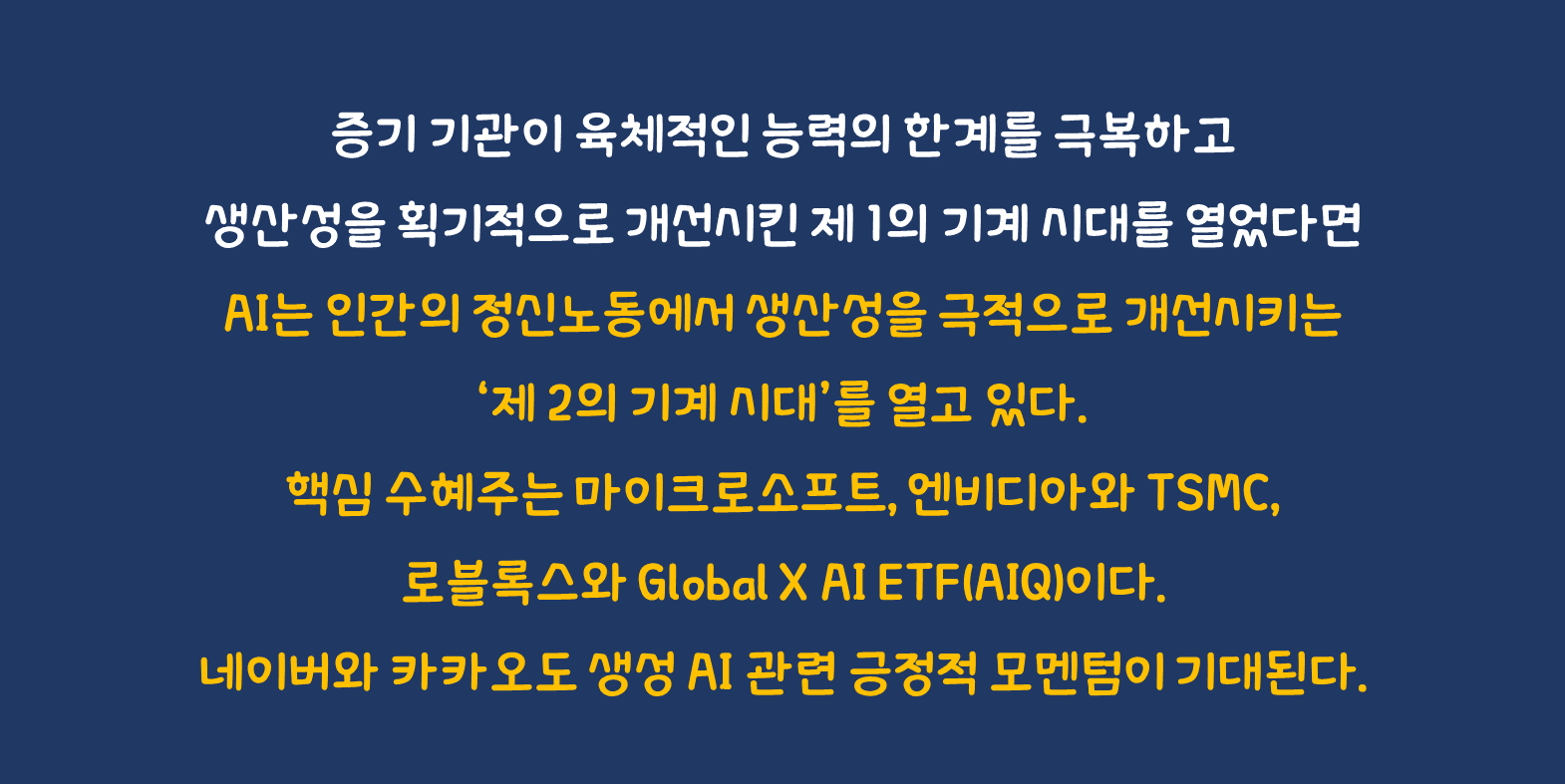 증기 기관이 육체적인 능력의 한계를 극복하고 생산성을 획기적으로 개선시킨 제 1의 기계 시대를 열었다면 AI는 인간의 정신노동에서 생산성을 극적으로 개선시키는 ‘제 2의 기계 시대’(브린욜프슨, 맥아피 저서 제목 인용)를 열고 있다. 핵심 수혜주는 마이크로소프트, 엔비디아와 TSMC, 로블록스와 Global X AI ETF(AIQ)이다. 네이버와 카카오도 생성 AI 관련 긍정적 모멘텀이 기대된다.