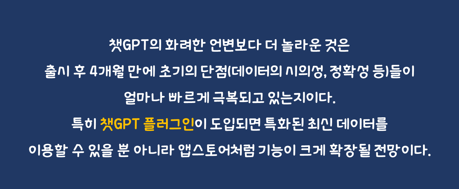 챗GPT의 화려한 언변보다 더 놀라운 것은 출시 후 4개월 만에 초기의 단점(데이터의 시의성, 정확성 등)들이 얼마나 빠르게 극복되고 있는지이다. 대량의 사용자 데이터가 확보되면서 모델은 더 발전했고 빅테크와 개발자들의 참여로 기능이 개선/확장되고 있다. 특히 챗GPT 플러그인이 도입되면 특화된 최신 데이터를 이용할 수 있을 뿐 아니라 앱스토어처럼 기능이 크게 확장될 전망이다.