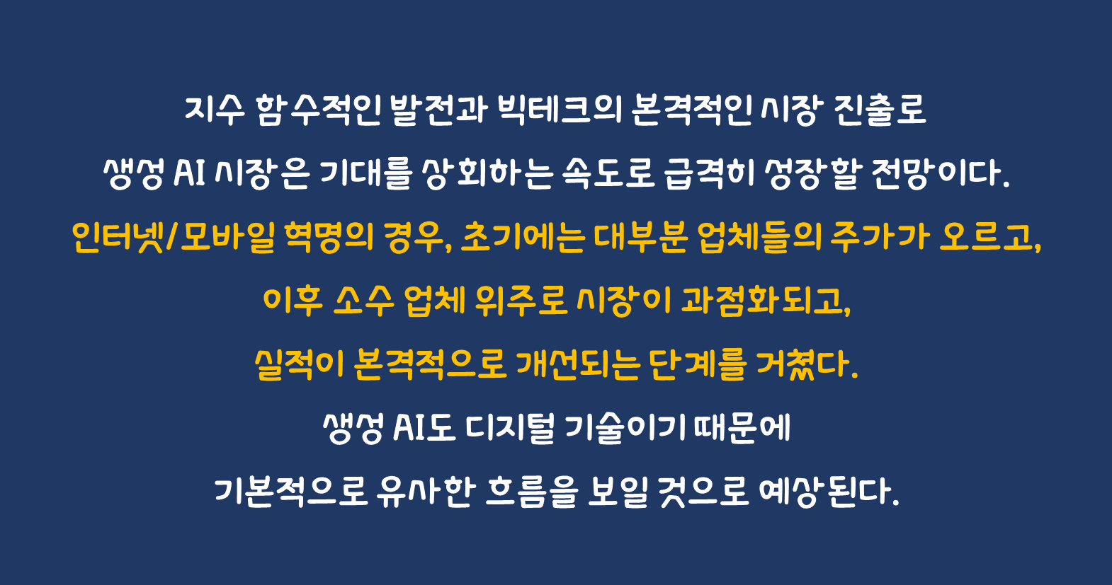 인터넷/모바일 혁명의 경우, 초기에는 대부분 업체들의 주가가 오르고, 이후 소수 업체 위주로 시장이 과점화되고, 실적이 본격적으로 개선되는 단계를 거쳤다. 이는 디지털 기술의 특징(재생산의 한계 비용이 제로, 동시 사용 가능, 상대 우위의 절대 우위화, 네트워크 효과의 중요성 등) 때문이었는데, 생성 AI도 디지털 기술이기 때문에 기본적으로 유사한 흐름을 보일 것으로 예상된다.