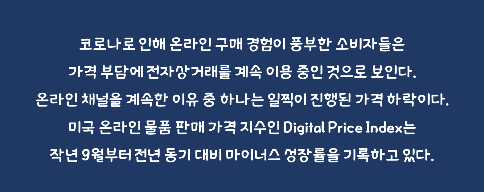 온라인으로 이동한 소비자들: 코로나로 인해 온라인 구매 경험이 풍부한 소비자들은 가격 부담에 전자상거래를 계속 이용 중인 것으로 보인다. 3월 미국 소매 판매 규모는 전월 대비 1% 감소한 반면 온라인 소매 판매 규모는 월간 1.9% 상승하는 모습을 보였다. 온라인 채널을 계속한 이유 중 하나는 일찍이 진행된 가격 하락이다. 미국 온라인 물품 판매 가격 지수인 Digital Price Index는 작년 9월부터 전년 동기 대비 마이너스 성장률을 기록하고 있다.