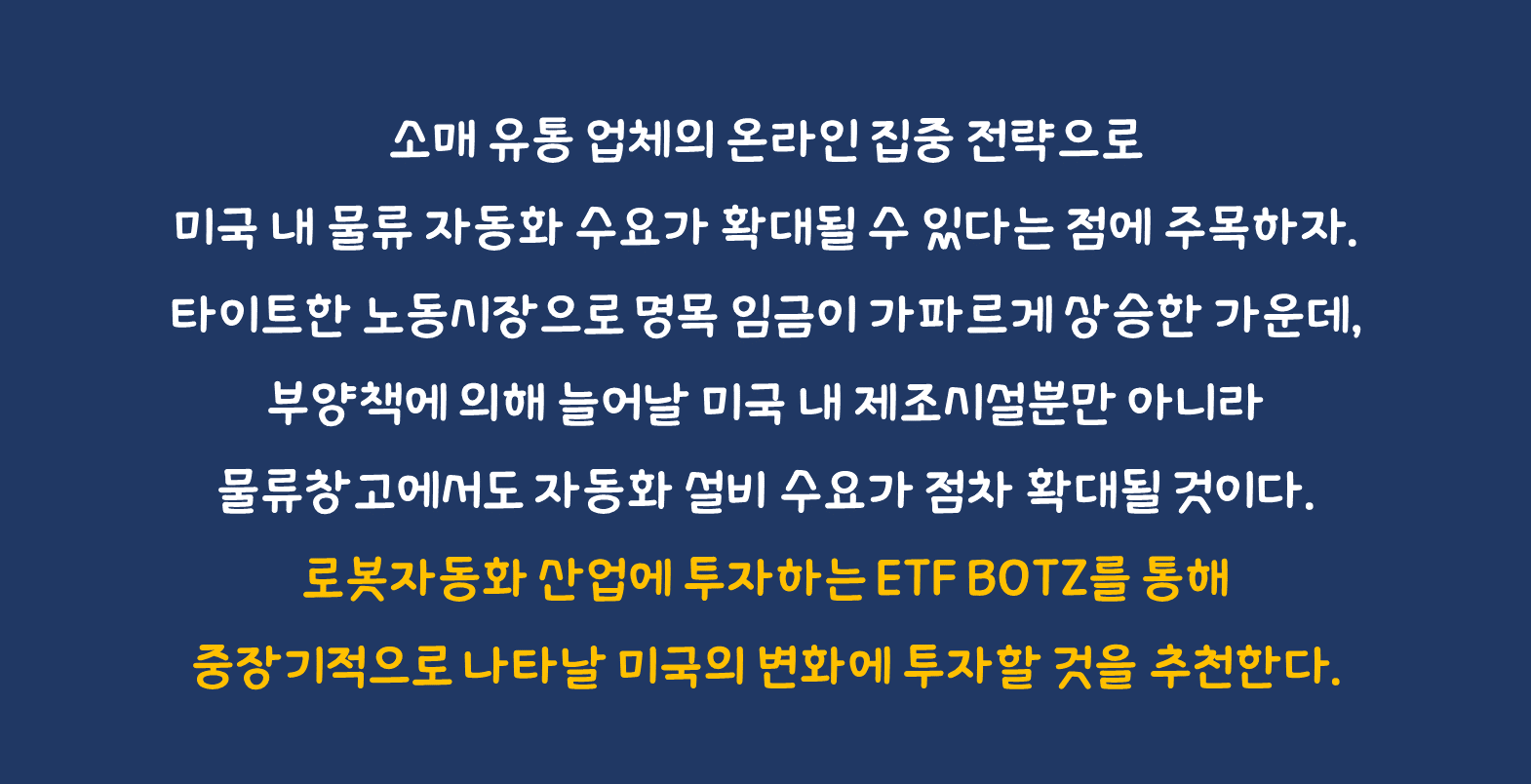 소매 유통에서도 원하는 자동화: 소매 유통 업체의 온라인 집중 전략으로 미국 내 물류 자동화 수요가 확대될 수 있다는 점에 주목하자. 월마트는 효율적인 온라인 주문 대응을 위해 구조조정에서 한발 더 나아가 자동화 확대 계획을 발표했다. 작년 5월 물류 자동화 기업인 심보틱에 지분투자를 하는 등적극적인 물류 자동화를 진행한 결과 월마트는 지난 1월 전체 배송의 3분의 1이 자동화된 시설을 통해 이뤄졌다고 밝혔다. 타이트한 노동시장으로 명목 임금이 가파르게 상승한 가운데, 부양책에 의해 늘어날 미국 내 제조시설뿐만 아니라 물류창고에서도 자동화 설비 수요가 점차 확대될 것이다. 로봇자동화 산업에 투자하는 ETF Global X Robotics & Artificial Intelligence EIF[BOTZ: US]를 통해 중장기적으로 나타날 미국의 변화에 투자할 것을 추천한다.