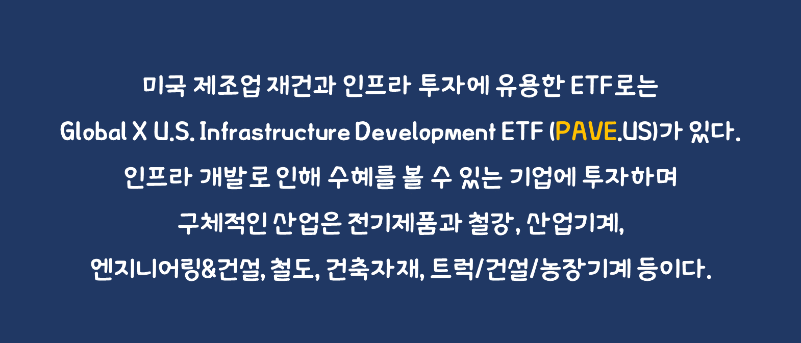 미국 제조업 재건과 인프라 투자에 유용한 ETF로는 Global X U.S. Infrastructure Development ETF (PAVE.US)가 있다. 중장비, 엔지니어링 및 건설과 관련된 기업을 포함해 미국에서 도로, 교량, 철도 및 시설, 전력망 등의 인프라 개발로 인해 수혜를 볼 수 있는 기업에 투자하며 구체적인 산업은 전기제품과 철강, 산업기계, 엔지니어링&건설, 철도, 건축자재, 트럭/건설/농장기계 등이다.