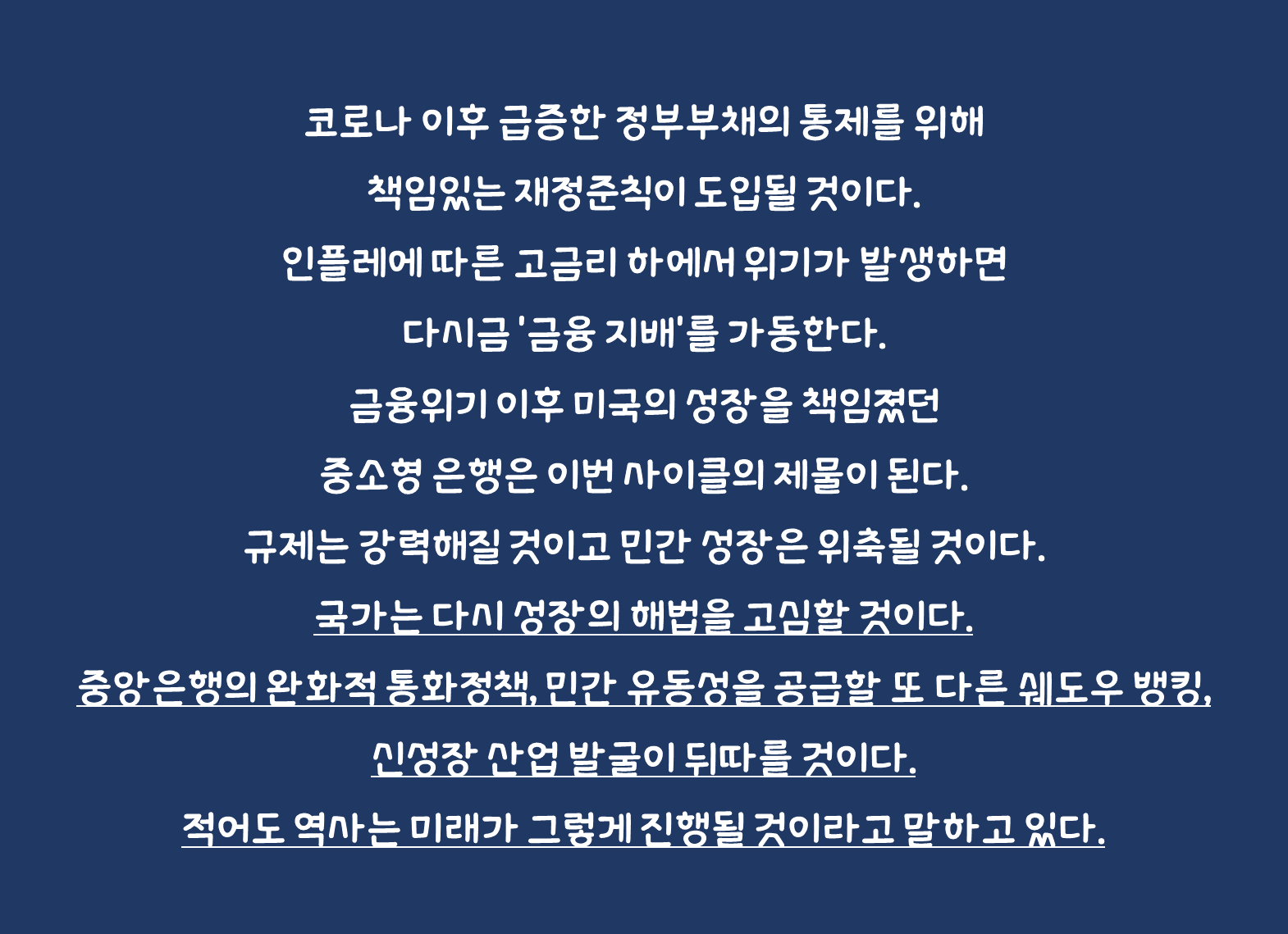 코로나 이후 급증한 정부부채의 통제를 위해 책임있는 재정준칙이 도입될 것이다. 미국의 부채한도 협상 불협화음은 그 과정의 일환이다. 대규모 정부 현금살포의 의도치 않은 결과인 인플레이션은 재정준칙 하에서 진압된다. 저금리를 위해 불가피한 선택이다. 인플레에 따른 고금리 하에서 위기가 발생하면 다시금 '금융 지배'를 가동한다. 금융위기 이후 미국의 성장을 책임졌던 중소형 은행은 이번 사이클의 제물이 된다. 규제는 강력해질 것이고 민간 성장은 위축될 것이다. 국가는 다시 성장의 해법을 고심할 것이다. 중앙은행의 완화적 통화정책, 민간 유동성을 공급할 또 다른 쉐도우 뱅킹, 신성장 산업 발굴이 뒤따를 것이다. 적어도 역사는 미래가 그렇게 진행될 것이라고 말하고 있다. 인구 구조의 변화 세계대전(판데믹), 현금살포의 상설화 만이 이를 바꿀 수 있다.