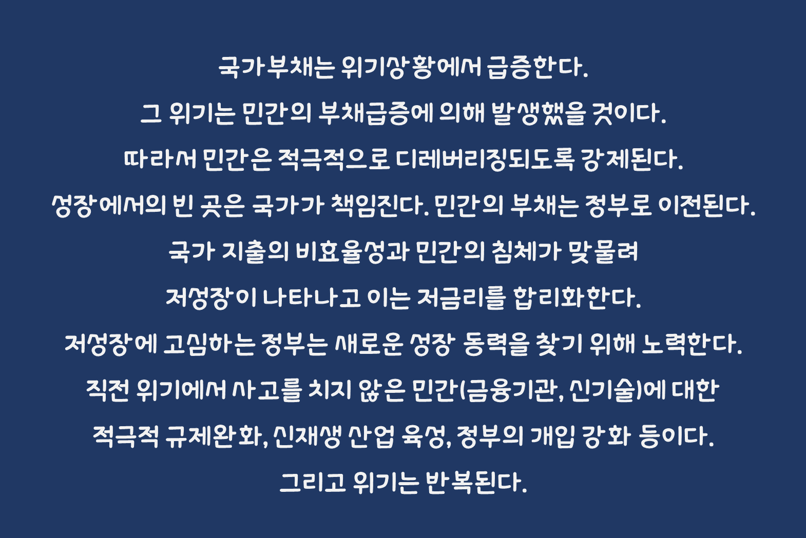 금융 지배(Financial Dominance)가 다가오고 있다. '금융 지배'란 특정 주체(주로 국가)의 부채가 과도하게 커졌을 때 어떠한 이유로든 금리가 오르지 못하게 하거나 낮게 유지되도록 사전에 차단하는 국가 차원의 체제를 의미한다. 그 방법으로는 중앙은행이 제대로 긴축을 못하게 하거나 완화적 정책을 유지하도록 하기(QE, ZRP, YCC 등), 장기투자기관의 건전성에 대한 강한 규제(보험 연기금), 은행 건전성 규제(Basel III) 등이 주로 활용된다. 이는 2008년 금융위기 이후 활용되어 영구적인 디플레가 고착화되는데 한몫했다. 이는 마치 음모론처럼 들리지만 오히려 역사적으로 자연스러운 흐름이다. 국가부채는 위기상황에서 급증한다. 그 위기는 민간의 부채급증에 의해 발생했을 것이다. 따라서 민간은 적극적으로 디레버리징되도록 강제된다. 성장에서의 빈 곳은 국가가 책임진다. 민간의 부채는 정부로 이전된다. 위기의 진앙지인 금융기관은 제물이 되고 규제의 쇠사슬에 옭아매진다. 국가 지출의 비효율성과 민간의 침체가 맞물려 저성장이 나타나고 이는 저금리를 합리화한다. 저성장에 고심하는 정부는 새로운 성장 동력을 찾기 위해 노력한다. 직전 위기에서 사고를 치지 않은 민간(금융기관, 신기술)에 대한 적극적 규제완화, 신재생 산업 육성, 정부의 개입 강화 등이다. 그리고 위기는 반복된다.