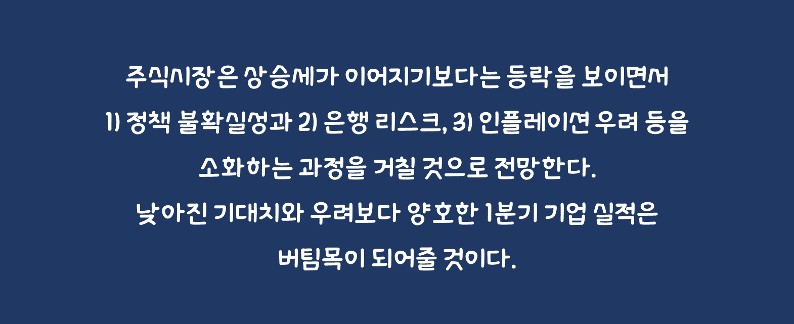 주식시장은 상승세가 이어지기보다는 등락을 보이면서 1) 정책 불확실성과 2) 은행 리스크, 3) 인플레이션 우려 등을 소화하는 과정을 거칠 것으로 전망한다. 낮아진 기대치와 우려보다 양호한 1분기 기업 실적은 버팀목이 되어줄 것이다. 지수 전략보다는 개별 종목별 주가 흐름이 달리 나타날 것에 대비한 투자 전략이 유효하다. 호실적을 기록하며 AI 테마를 주도하거나 펀더멘털 대비 주가 반등이 더딘 대형 기술주는 5월 증시에서 좋은 대안이 될 것이다. 그리고, 오랜 업력과 수요를 바탕으로 견고한 이익 증가를 이어갈 것으로 기대되는 기업들에 대한 관심을 권고한다.