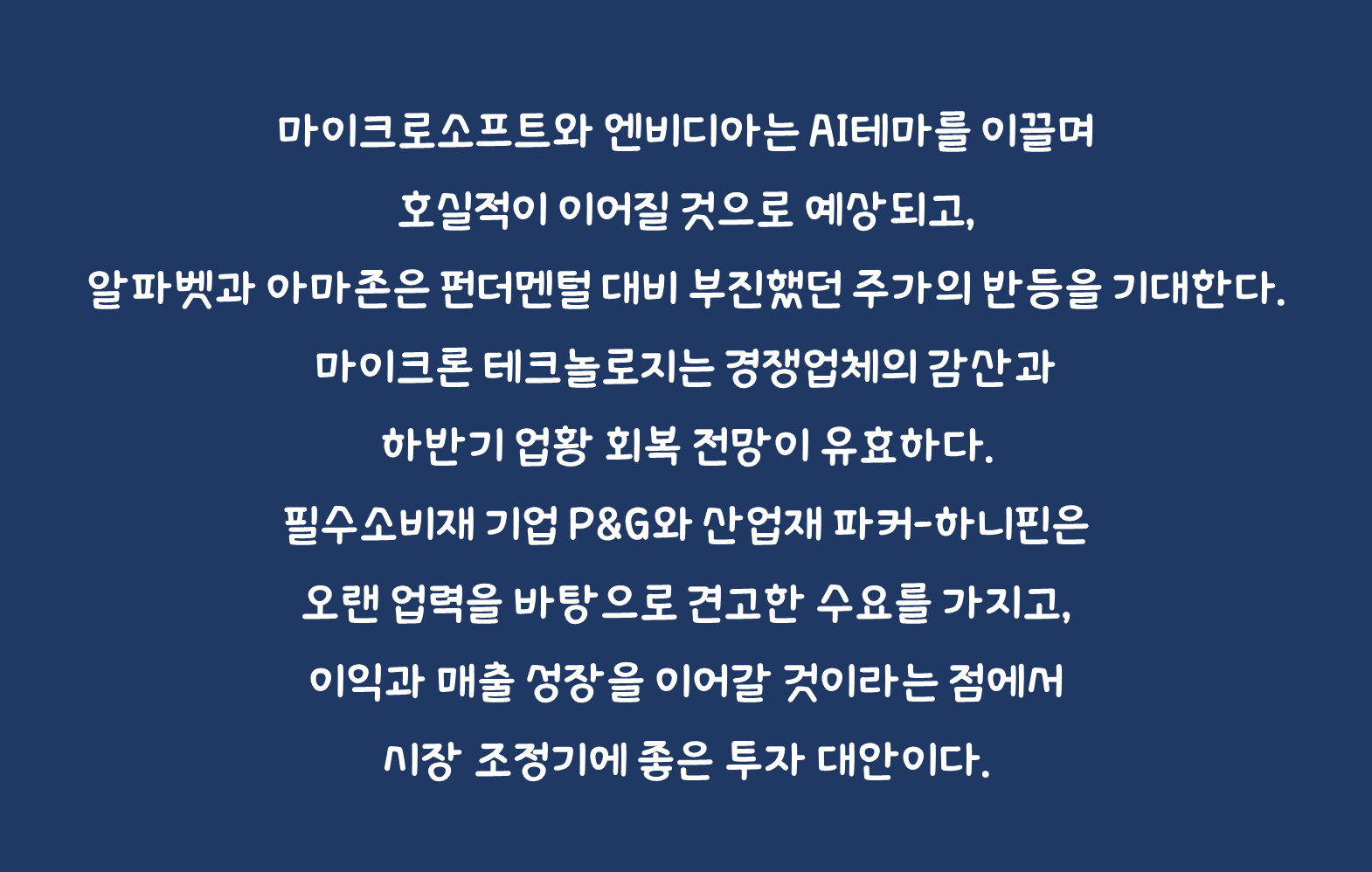5월 투자 아이디어는 1) AI 확산을 주도하는 기업과 2) 펀더멘털 대비 주가 반등이 약했던 대형 기술주, 그리고 3) 확고한 시장 지위를 바탕으로 실적이 증가하는 기업이다. 마이크로소프트와 엔비디아는 AI 테마를 이끌며 호실적이 이어질 것으로 예상되고, 알파벳과 아마존은 펀더멘털 대비 부진했던 주가의 반등을 기대한다. 마이크론 테크놀로지는 경쟁업체의 감산과 하반기 업황 회복 전망이 유효하다. 필수소비재 기업 P&G와 산업재 파커-하니핀은 오랜 업력을 바탕으로 견고한 수요를 가지고, 이익과 매출 성장을 이어갈 것이라는 점에서 시장 조정기에 좋은 투자 대안이다.