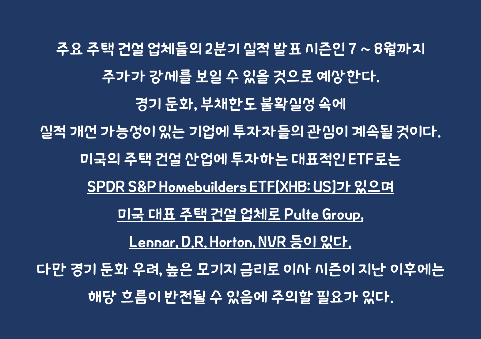 2분기 실적 발표 시즌까지 주택 건설 기업들의 양호한 실적에 대한 기대감 유지 예상: 주요 주택 건설 업체들의 2분기 실적 발표 시즌인 7 ~ 8월까지 주가가 강세를 보일 수 있을 것으로 예상한다. 하반기 연준의 금리 인하가 예상되나 그 이전까지는 높은 모기지 금리가 유지되며 구축 주택의 매물 출회가 점진적으로 이뤄질 것이다. 두번째로 미국의 이사시즌은 학기가 종료되는 4월부터 학기가 시작되는 9월 이전이다. 높은 가격에도 2분기 동안 수요가 일정 수준 유지될 수 있을 것으로 기대한다. 마지막으로 경기 둔화, 부채한도 불확실성 속에 실적 개선 가능성이 있는 기업에 투자자들의 관심이 계속될 것이다. 미국의 주택 건설 산업에 투자하는 대표적인 ETF로는 SPDR S&P Homebuilders ETF[XHB: US]가 있으며 구성 종목 중 미국 대표 주택 건설 업체로 Pulte Group, Lennar, D.R. Horton, NVR 등이 있다. 다만 경기 둔화 우려, 높은 모기지 금리로 이사 시즌이 지난 이후에는 해당 흐름이 반전될 수 있음에 주의할 필요가 있다.