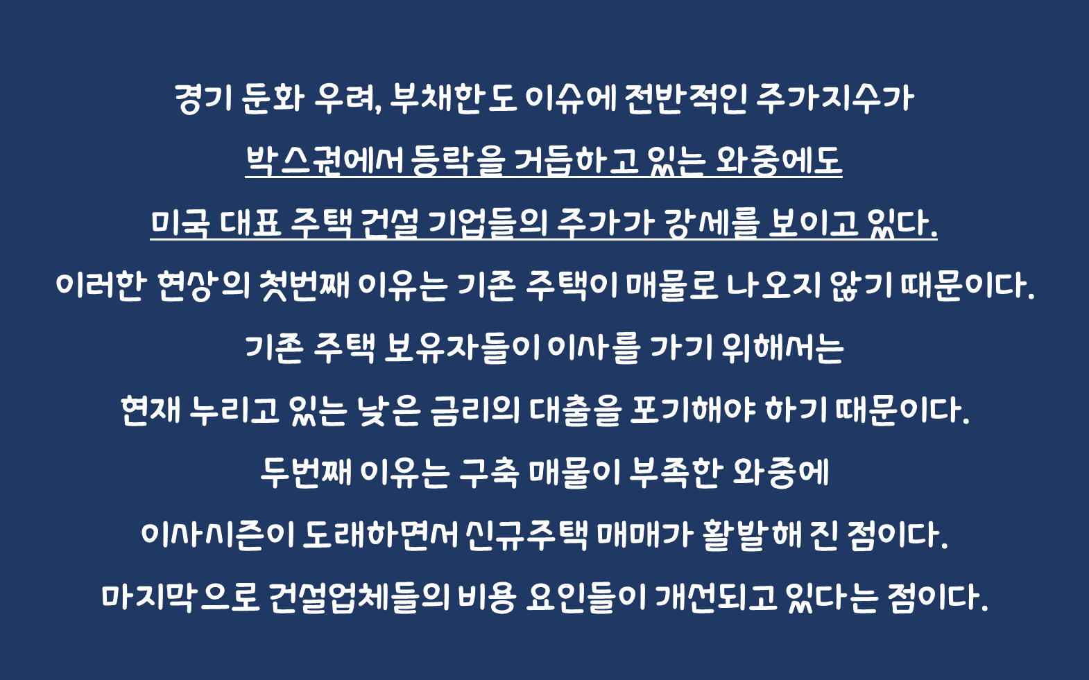 연초 이후 강세를 보인 미국 주택 건설 기업: 경기 둔화 우려, 부채한도 이슈에 전반적인 주가지수가 박스권에서 등락을 거듭하고 있는 와중에도 미국 대표 주택 건설 기업들의 주가가 강세를 보이고 있다. 이러한 현상의 첫번째 이유는 기존 주택이 매물로 나오지 않기 때문이다. 기존 주택 중 매물로 등록된 주택의 수는 전년동기대비 마이너스를 기록 중이다. 고정금리 주택담보 대출 비중이 높은 미국에서, 기존 주택 보유자들이 이사를 가기 위해서는 현재 누리고 있는 낮은 금리의 대출을 포기해야 하기 때문이다. 기존 모기지 대출 금리는 주로 2.5% ~ 4.5%에 형성된 반면, 신규 모기지 금리는 평균 6.4% 수준이다. 두번째 이유는 구축 매물이 부족한 와중에 이사시즌이 도래하면서 신규주택 매매가 활발해 진 점이다. 미국 신규 단독 주택 완공 후 판매 소요 기간은 3월 기준 약 2.8개월로 저점 대비 상승하 기는 했지만 여전히 2013 ~ 2019년 평균인 3.36개월보다 낮은 수준이다. 신규 단독 주택의 매물은 2022년 10월 정점 이후 점차 하락 중이다. 마지막으로 건설업체들의 비용 요인들이 개선되고 있다는 점이다. 건자재 가격 지수는 지난해 5월 정점을 기록한 이후 낮아졌으며, 타이틀 42 종료로 미국 노동력 부족에 따른 임금 상승률 둔화 기대감도 존재한다. 불확실성이 높아진 지금 다소 안정적인 실적이 예상되는 기업에 투자자들의 관심이 높아지고 있다.