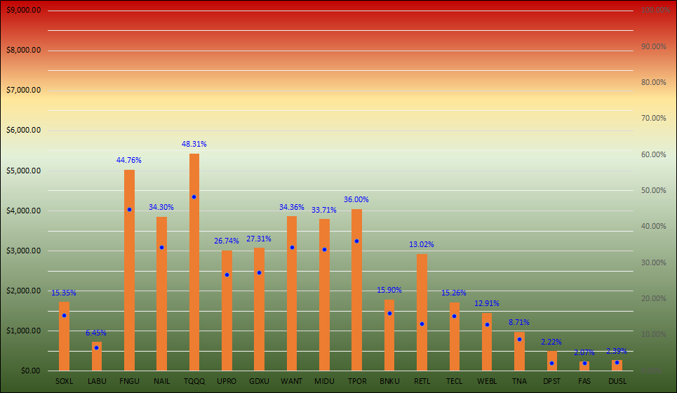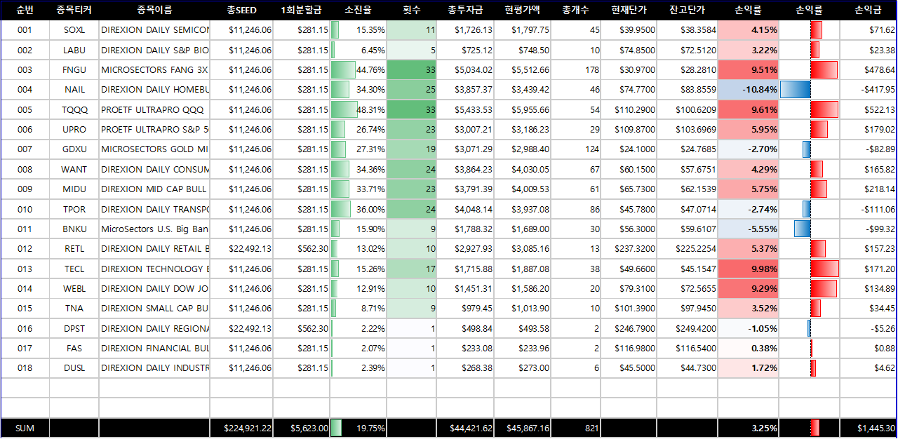 7) 무매법의 가상 시드 20%를 인정함에 따라 전체 투자액을 늘릴 수 있었고 추가 신규종목을 3개 새로 편입했습니다. DPST, FAS, DUSL입니다. 당시 기준 RSI가 60이 넘지 않는 종목이었습니다. 기대가 되네요.