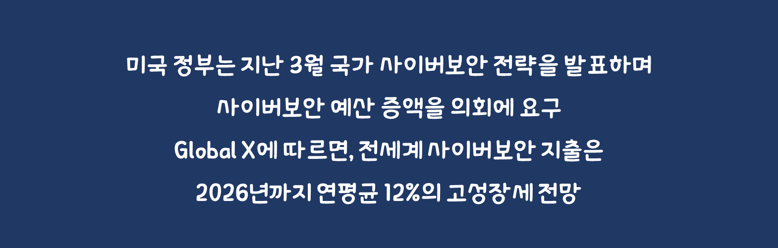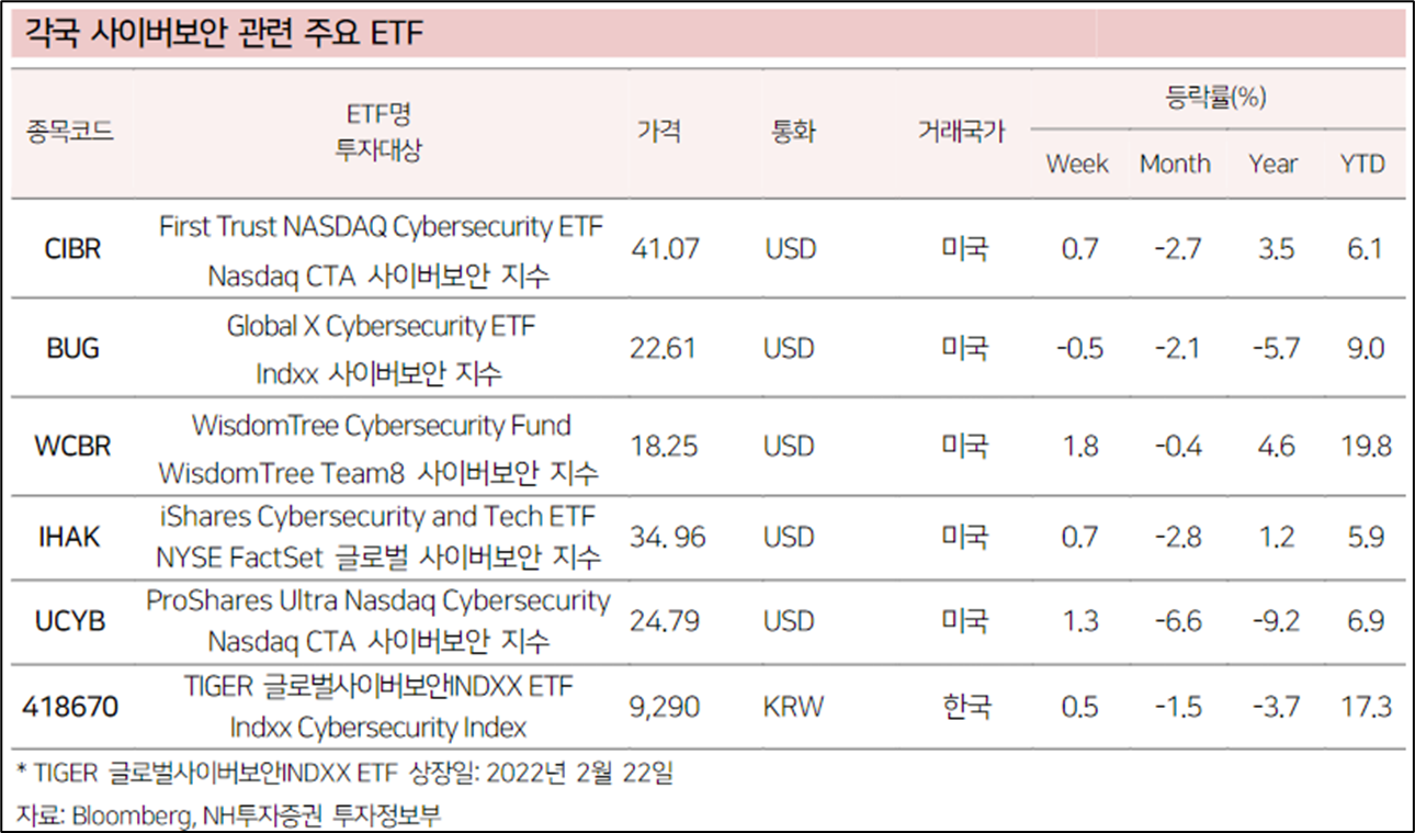 - 사이버보안 기술의 모든 분야에서 우위를 점한 기업이 없는 상황으로 광범위한 사이버보안 시장 투자에는 개별 종목보다는 ETF를 통한 분산투자가 효율적임