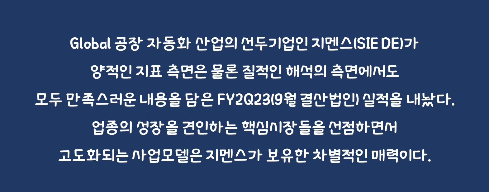 FY2Q23 실적 Review: Global 공장 자동화 산업의 선두기업인 지멘스(SIE DE)가 양적인 지표 측면은 물론 질적인 해석의 측면에서도 모두 만족스러운 내용을 담은 FY2Q23(9월 결산법인) 실적을 내놨다. 주력사업들의 외형 성장률 및 수익성이 전반적으로 호전되면서 FY2023 Guidance도 상향 조정했다. 특히, 실적의 개선이 전 사업부로 확대되고 있다는 점에 주목한다. 업종의 성장을 견인하는 핵심시장들을 선점하면서 고도화되는 사업모델은 지멘스가 보유한 차별적인 매력이다. 기업의 가치가 원자재 가격 및 경기사이클에 의해 휘둘리는 일부 미국 전통기업들 대비 지멘스의 장기적인 초과수익을 기대하는 이유다. 그럼에도 미국의 산업재와 비교해 보면 지멘스의 Valuation은 여전히 저평가된 수준이다. 핵심적인 업종 내 성장 시장을 선점하고 있음에도, 미국의 동종 업종 대비 할인된 Valuation에서 거래되는 지멘스에 주목할 필요가 있다는 의견을 제시한다.