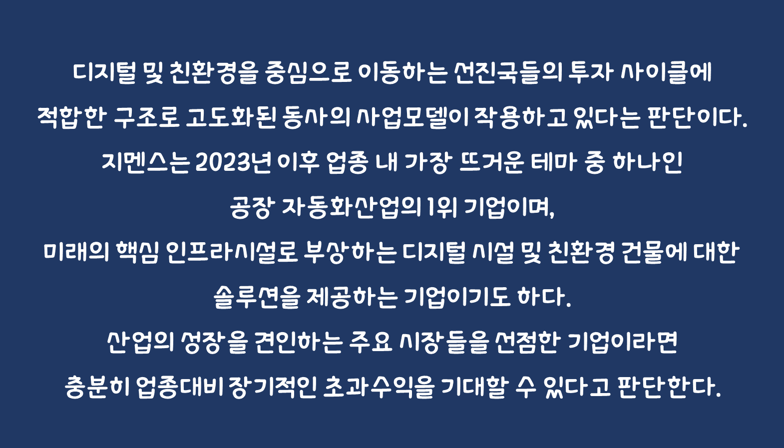 분명한 이유가 있는 미국 전통산업 대비 초과수익: 2023년 이후 지멘스의 수익률은 동종 업종인 미국의 산업재 대비 상당히 우수한 성과를 기록하고 있는 중이다. 디지털 및 친환경을 중심으로 이동하는 선진국들의 투자 사이클에 적합한 구조로 고도화된 동사의 사업모델이 작용하고 있다는 판단이다. 지멘스는 2023년 이후 업종 내 가장 뜨거운 테마 중 하나인 공장 자동화산업의 1위 기업이며, 미래의 핵심 인프라시설로 부상하는 디지털 시설 및 친환경 건물에 대한 솔루션을 제공하는 기업이기도 하다. 산업의 성장을 견인하는 주요 시장들을 선점한 기업이라면 충분히 업종대비 장기적인 초과수익을 기대할 수 있다고 판단한다. 결론적으로, 지멘스는 기업가치가 원자재 가격 및 경기사이클의 변화에 일방적으로 의존하는 일부 전통산업 대비 Valuation의 Premium을 누릴 수 있는 요건을 충분히 갖춘 기업인 것으로 평가한다. 그럼에도 동사의 12개월 FWD 실적 기준 PER은 여전히 미국 산업재 업종 대비 저평가된 상황이다. 산업의 성장을 선도하는 사업모델과 매력적인 Valuation을 겸비한 지멘스에 주목할 필요가 있다는 의견을 제시한다.