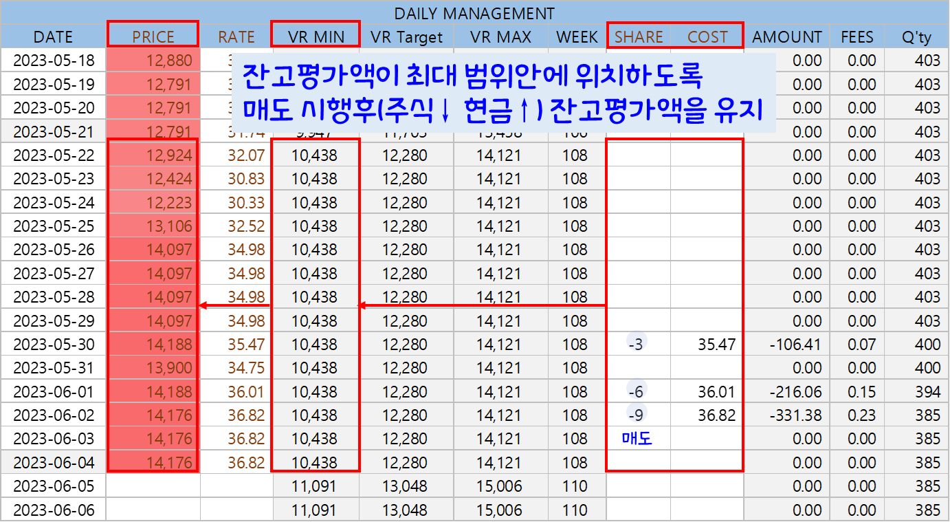 3) 매수한계는 POOL의 55%이었고, 이번 싸이클에 VR 밴드 상단에 도달하며 3차례 매도가 발생했습니다. (매도후 POOL로 보유)