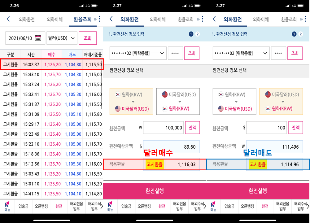 달러를 매수할 때는 수수료를 붙여 좀 더 비싸게 사게하고, 달러를 팔 때는 수수료를 떼고 좀 더 싸게 팔도록 합니다. 물론, 환전우대(환율우대)가 적용되지 않았을 때 기준입니다.