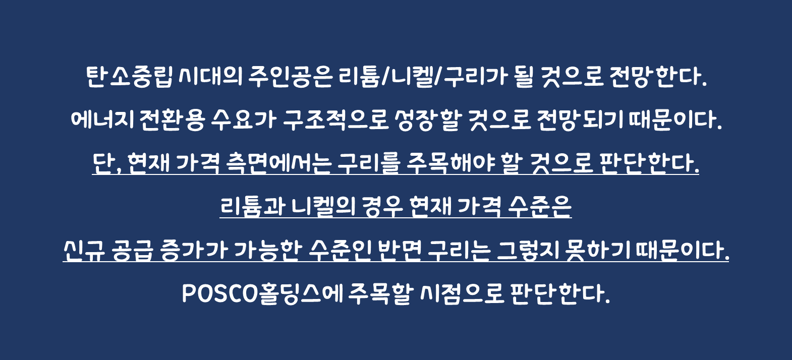 탄소중립 시대의 주인공은 리튬/니켈/구리가 될 것으로 전망한다. 에너지 전환용 수요가 구조적으로 성장할 것으로 전망되기 때문이다. 단, 현재 가격 측면에서는 구리를 주목해야 할 것으로 판단한다. 리튬과 니켈의 경우 현재 가격 수준은 신규 공급 증가가 가능한 수준인 반면 구리는 그렇지 못하기 때문이다. 리튬과 니켈이 그랬던 것처럼 구리도 에너지 전환용 수요 증가로 수급차질에 따른 가격 상승이 나타나야 신규 공급 증가가 가능할 것이다.