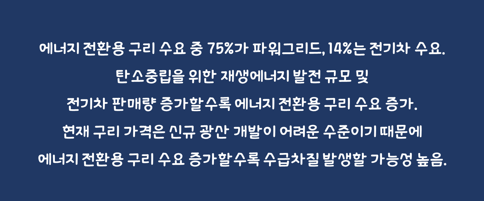 • 에너지 전환용 구리 수요 중 75%가 파워그리드, 14%는 전기차 수요.