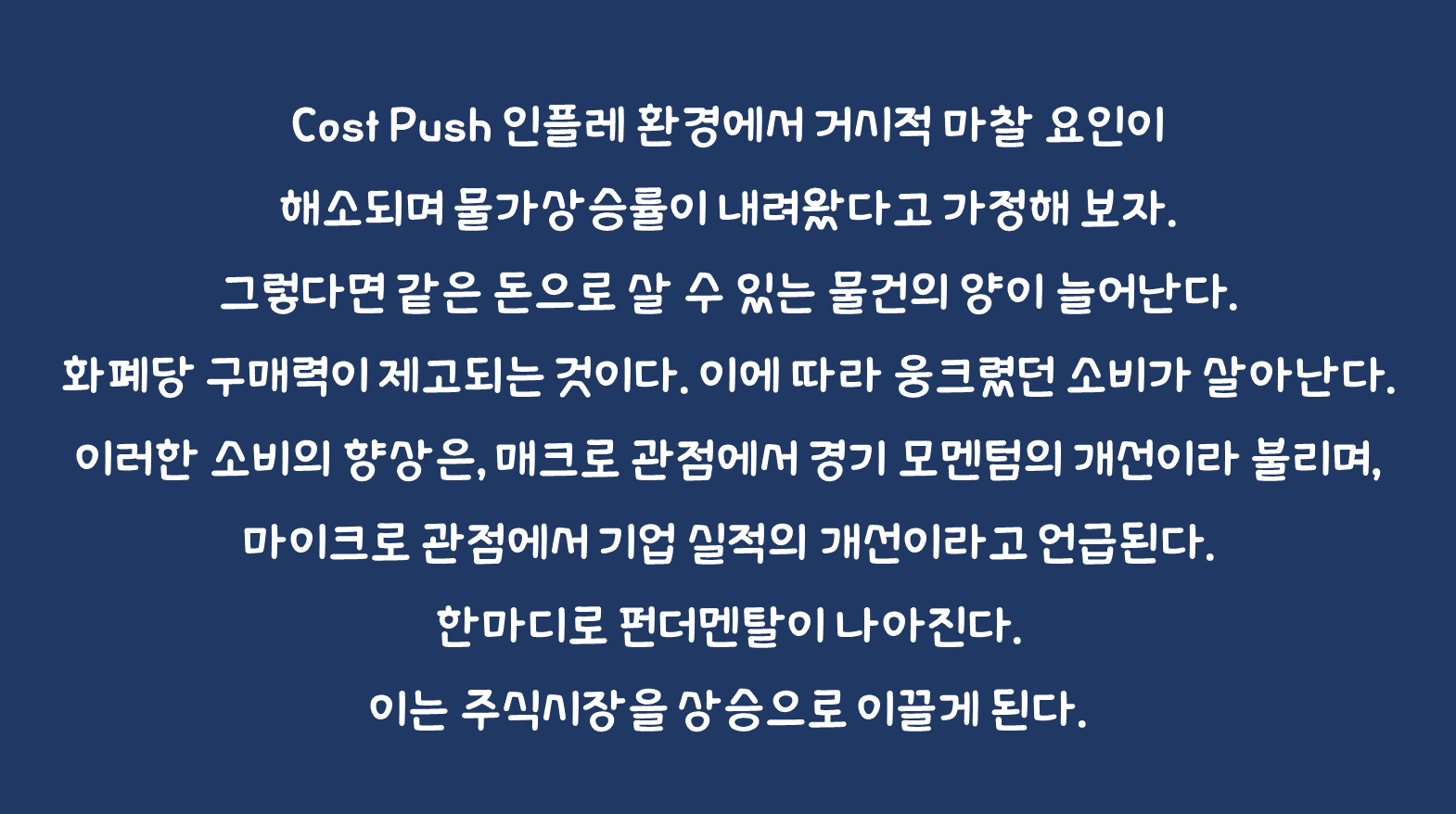 우선 물가의 기본적인 특성을 살펴보자. △ Demand Pull 인플레 환경에서 물가는 전형적인 경기후행지수다. 수요가 약화하면 물가상승률이 내려오는 것이 대표적인 예다. 그러나 Cost Push 인플레 환경에서 물가는 더 이상 경기후행지수가 아니다. 오히려 물가는 다른 변수에 영향을 주는 선도적인 역할을 한다. 예를 들어보겠다. Cost Push 인플레 환경에서 거시적 마찰 요인이 해소되며 물가상승률이 내려왔다고 가정해 보자. 그렇다면 같은 돈으로 살 수 있는 물건의 양이 늘어난다. 화폐당 구매력이 제고되는 것이다. 이에 따라 웅크렸던 소비가 살아난다. 이러한 소비의 향상은, 매크로 관점에서 경기 모멘텀의 개선이라 불리며, 마이크로 관점에서 기업 실적의 개선이라고 언급된다. 한마디로 펀더멘탈이 나아진다. 이는 주식시장을 상승으로 이끌게 된다. 이 같은 현상은 Cost Push 인플레가 만연했던 1970년대에 뚜렷했다. 그리고 현재도 마찬가지다.