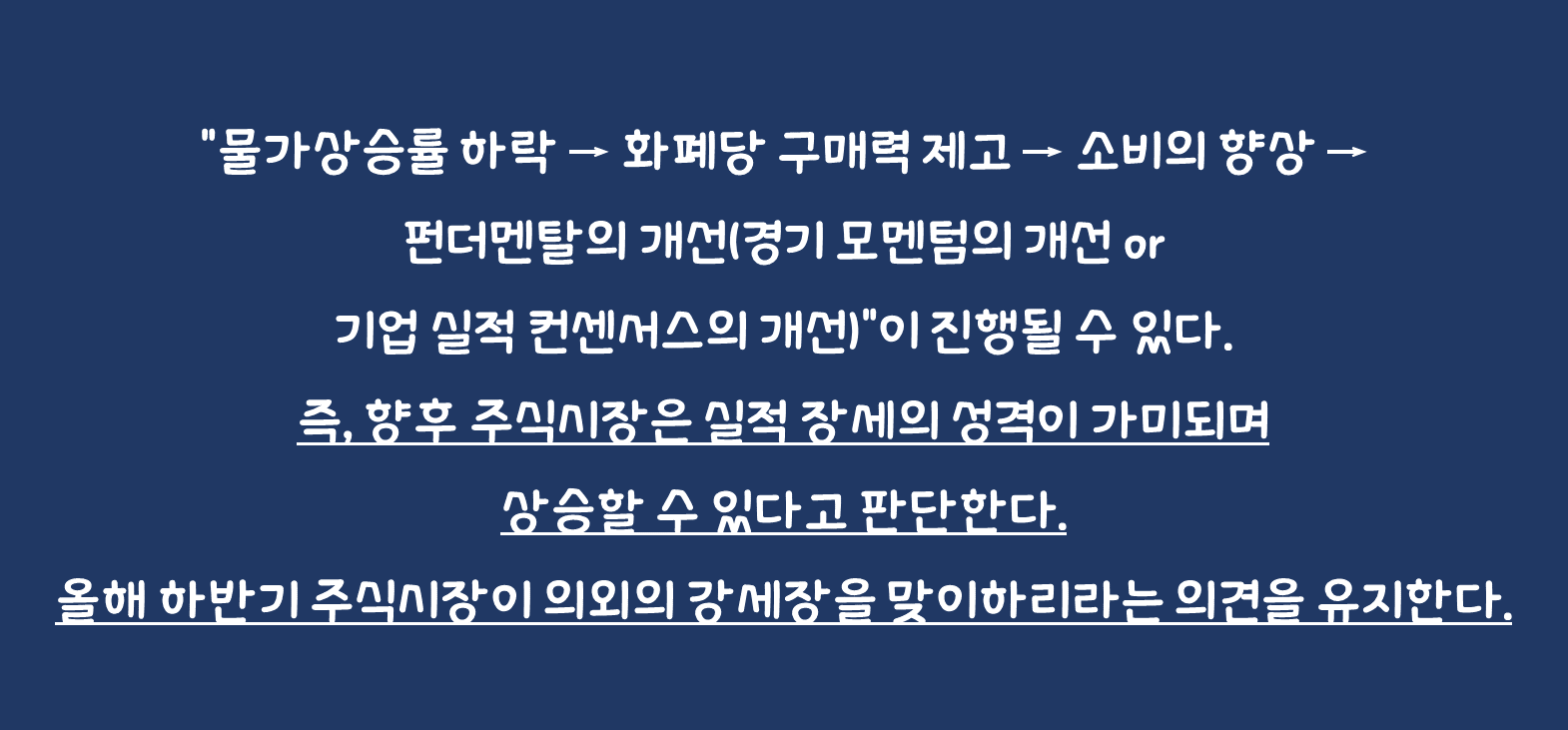 따라서 올해 하반기에는 다음의 메커니즘을 주목해야 한다. "물가상승률 하락 → 화폐당 구매력 제고 → 소비의 향상 → 펀더멘탈의 개선(경기 모멘텀의 개선 or 기업 실적 컨센서스의 개선)"이 진행될 수 있다. 즉, 향후 주식시장은 실적 장세의 성격이 가미되며 상승할 수 있다고 판단한다. 올해 하반기 주식시장이 의외의 강세장을 맞이하리라는 의견을 유지한다.