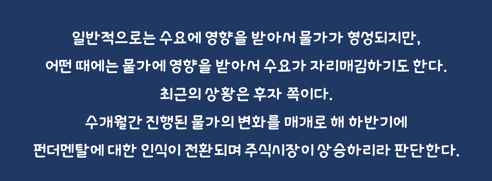 세상만사는 고정된 것이 아니다. 원인과 결과가 뒤바뀌는 경우가 허다하다. 물가 역시 마찬가지다. 일반적으로는 수요에 영향을 받아서 물가가 형성되지만, 어떤 때에는 물가에 영향을 받아서 수요가 자리매김하기도 한다. 최근의 상황은 후자 쪽이다. 수개월간 진행된 물가의 변화를 매개로 올해 하반기에 펀더멘탈에 대한 인식이 전환되며 주식시장이 상승하리라 판단한다.