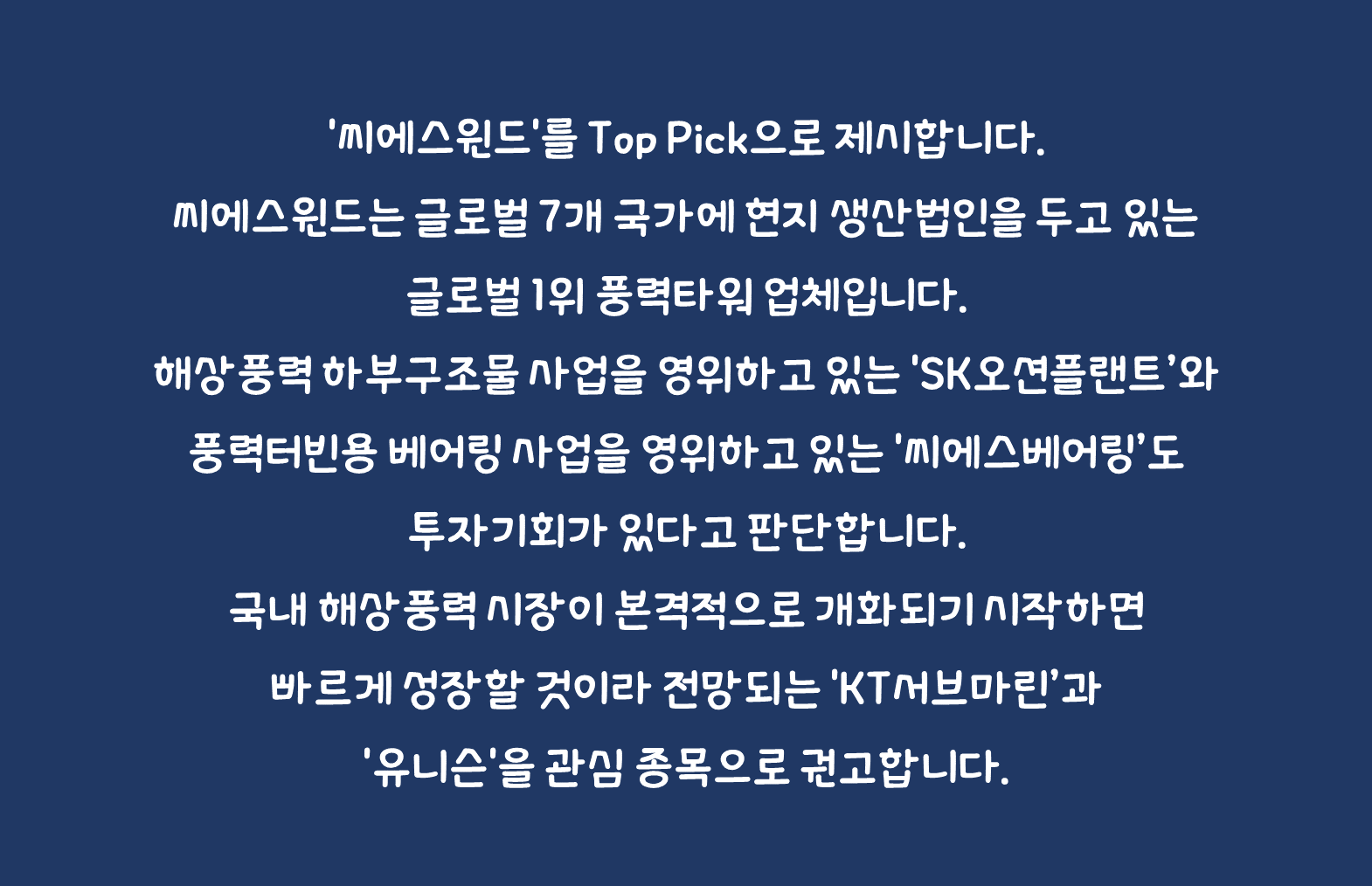 이에 더해, 국내 해상풍력 시장이 본격적으로 개화되기 시작하면 빠르게 성장할 것이라 전망되는 'KT서브마린'과 '유니슨'을 관심 종목으로 권고합니다.