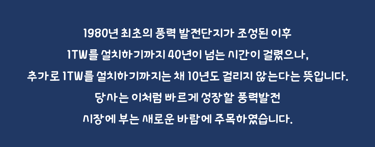 당사는 이처럼 빠르게 성장할 풍력발전 시장에 부는 새로운 바람에 주목하였습니다. 국내 기업들은 풍력발전 산업이 성장하는 흐름에 맞춰서 전략을 수립하고 있습니다. 이러한 방향성에 맞춰 적절하게 대응하는 기업이 향후 시장에서 우위를 점할 가능성이 크다고 판단합니다.