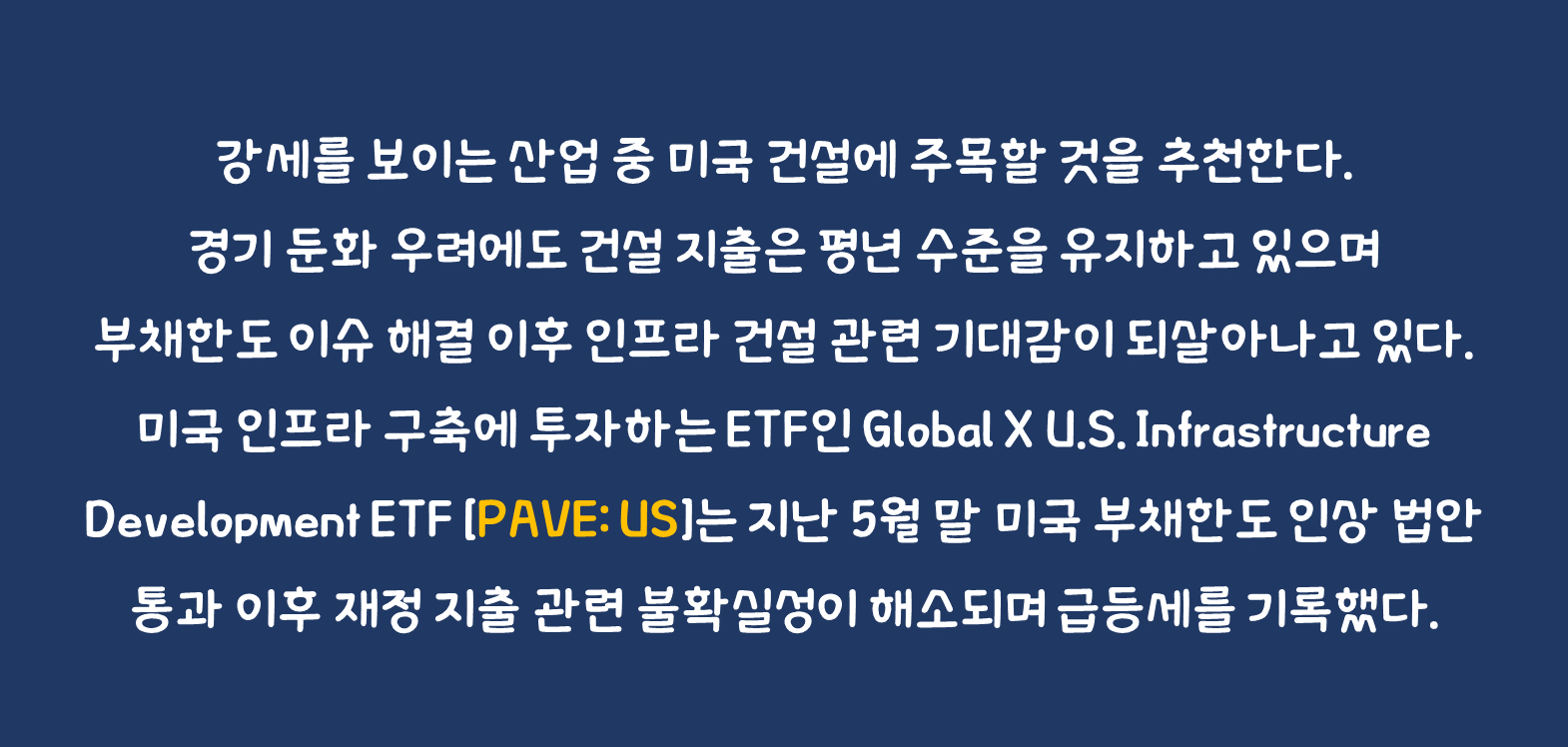 강세를 보이는 산업 중 미국 건설에 주목할 것을 추천한다. 경기 둔화 우려에도 건설 지출은 평년 수준을 유지하고 있으며 부채한도 이슈 해결 이후 인프라 건설 관련 기대감이 되살아나고 있다. 비거주부문 주도로 미국 전체 건설 지출은 2012년~2019년 건설지출 증가율 평균인 7% 수준을 기록 중이다. 부채한도 증액 이후 비영리 단체의 청정 에너지 보조금 활용 규칙, 수소 보조금 집행 계획 등 IRA, IIJA 관련 부양책 집행 계획 및 세부사항이 추가로 발표된 점도 해당 산업에 투자 심리 회복을 이끌고있다. 미국 인프라 구축에 투자하는 ETF인 Global X U.S. Infrastructure Development ETF [PAVE: US]는 지난 5월 말 미국 부채한도 인상 법안 통과 이후 재정 지출 관련 불확실성이 해소되며 급등세를 기록했다.