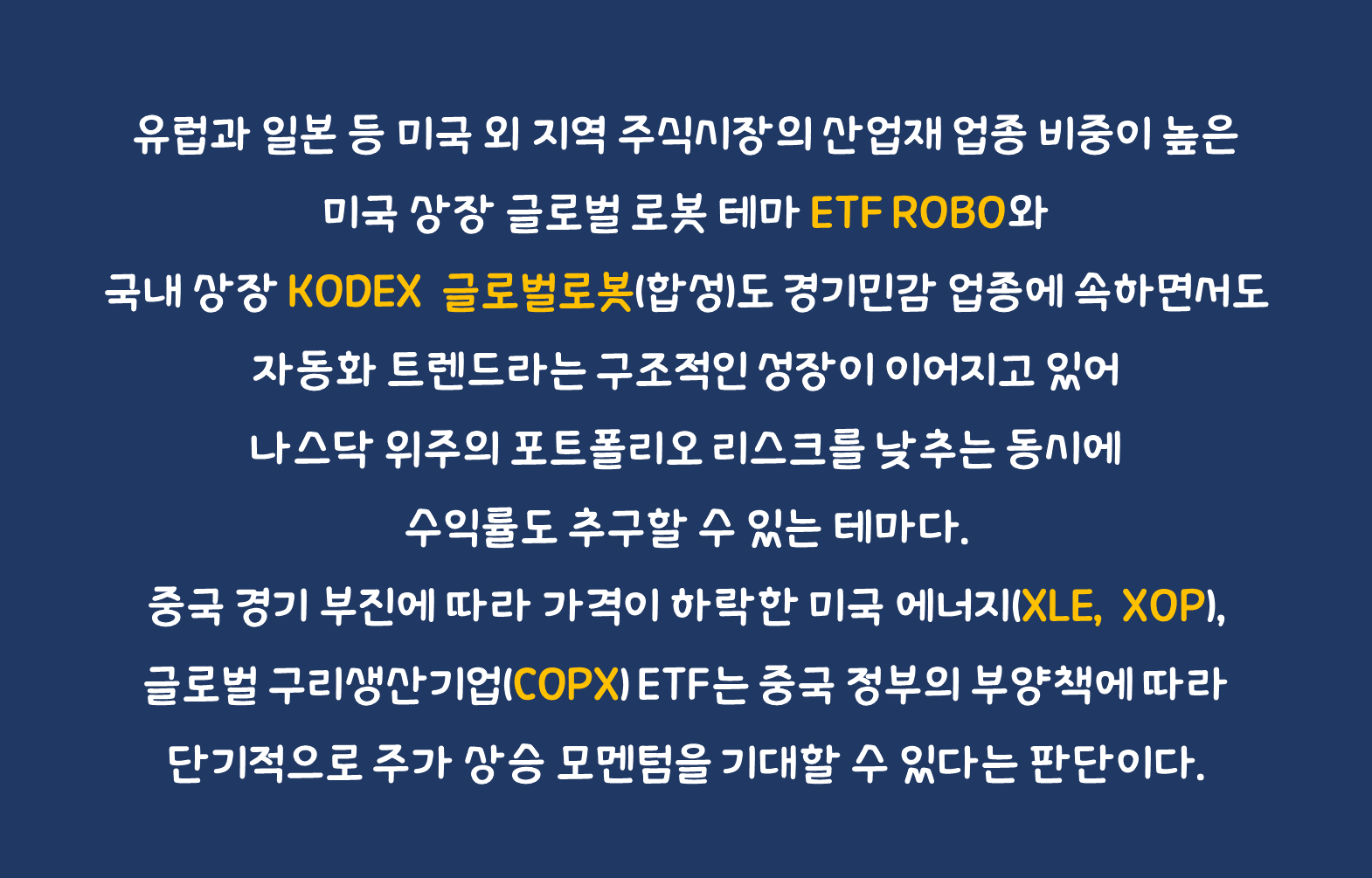 마지막으로 중국 경기 부진에 따라 가격이 하락한 미국 에너지(XLE, XOP), 글로벌 구리생산기업(COPX) ETF는 중국 정부의 부양책에 따라 단기적으로 주가 상승 모멘텀을 기대할 수 있다는 판단이다.