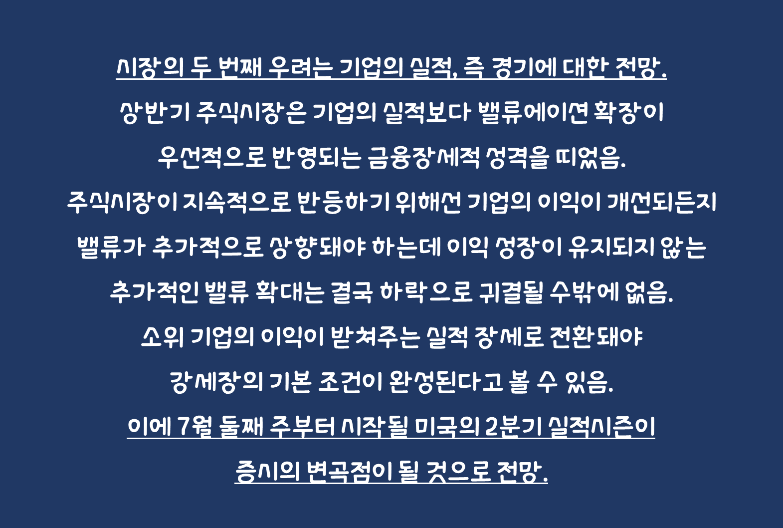 • 시장의 두 번째 우려는 기업의 실적, 즉 경기에 대한 전망. 상반기 주식시장은 기업의 실적보다 밸류에이션 확장이 우선적으로 반영되는 금융장세적 성격을 띠었음. 주식시장이 지속적으로 반등하기 위해선 기업의 이익이 개선되든지 밸류가 추가적으로 상향돼야 하는데 이익 성장이 유지되지 않는 추가적인 밸류 확대는 결국 하락으로 귀결될 수밖에 없음. 소위 기업의 이익이 받쳐주는 실적 장세로 전환돼야 강세장의 기본 조건이 완성된다고 볼 수 있음.