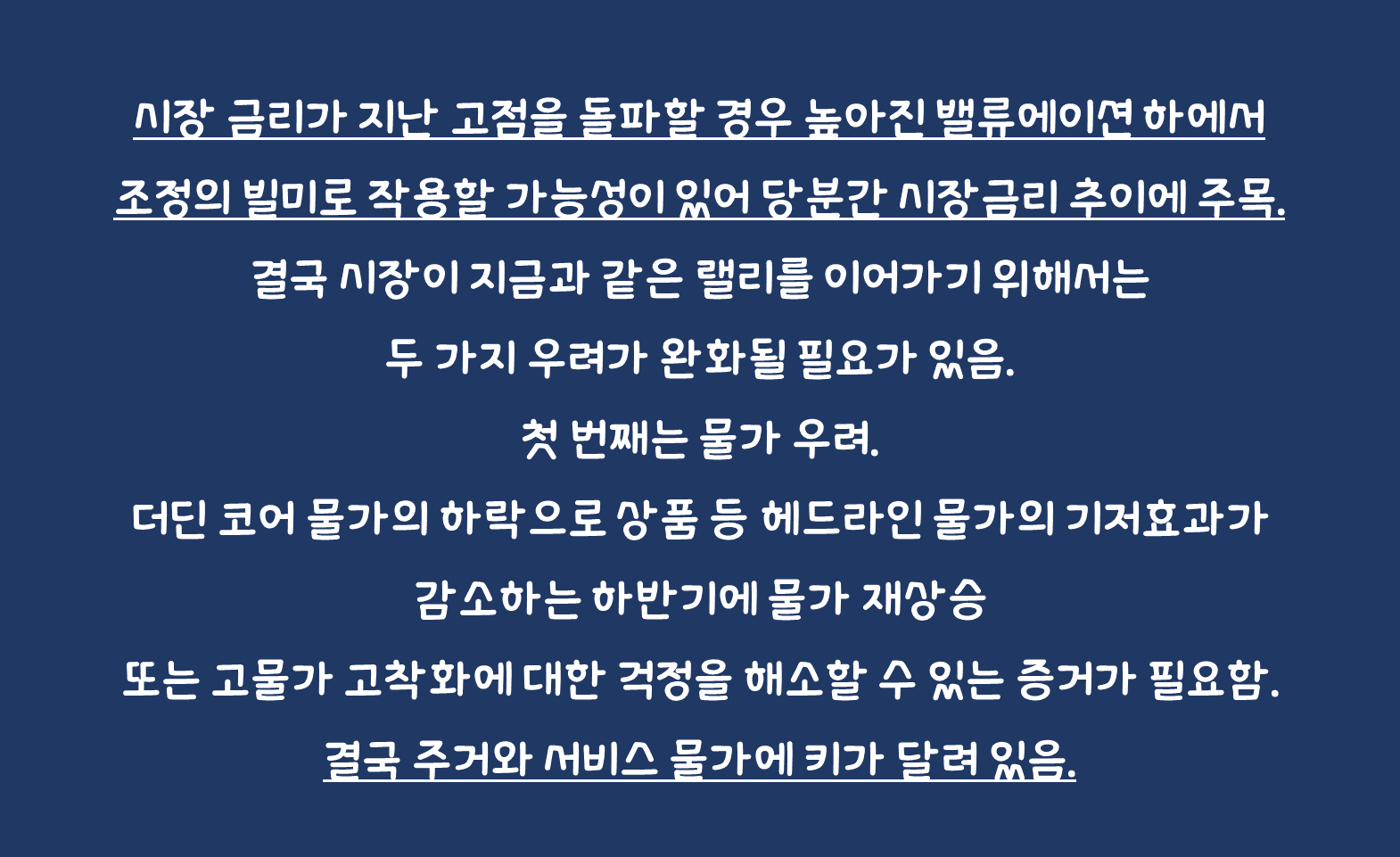 • 결국 시장이 지금과 같은 랠리를 이어가기 위해서는 두 가지 우려가 완화될 필요가 있음. 첫 번째는 물가 우려. 더딘 코어 물가의 하락으로 상품 등 헤드라인 물가의 기저효과가 감소하는 하반기에 물가 재상승 또는 고물가 고착화에 대한 걱정을 해소할 수 있는 증거가 필요함. 결국 주거와 서비스 물가에 키가 달려 있음.