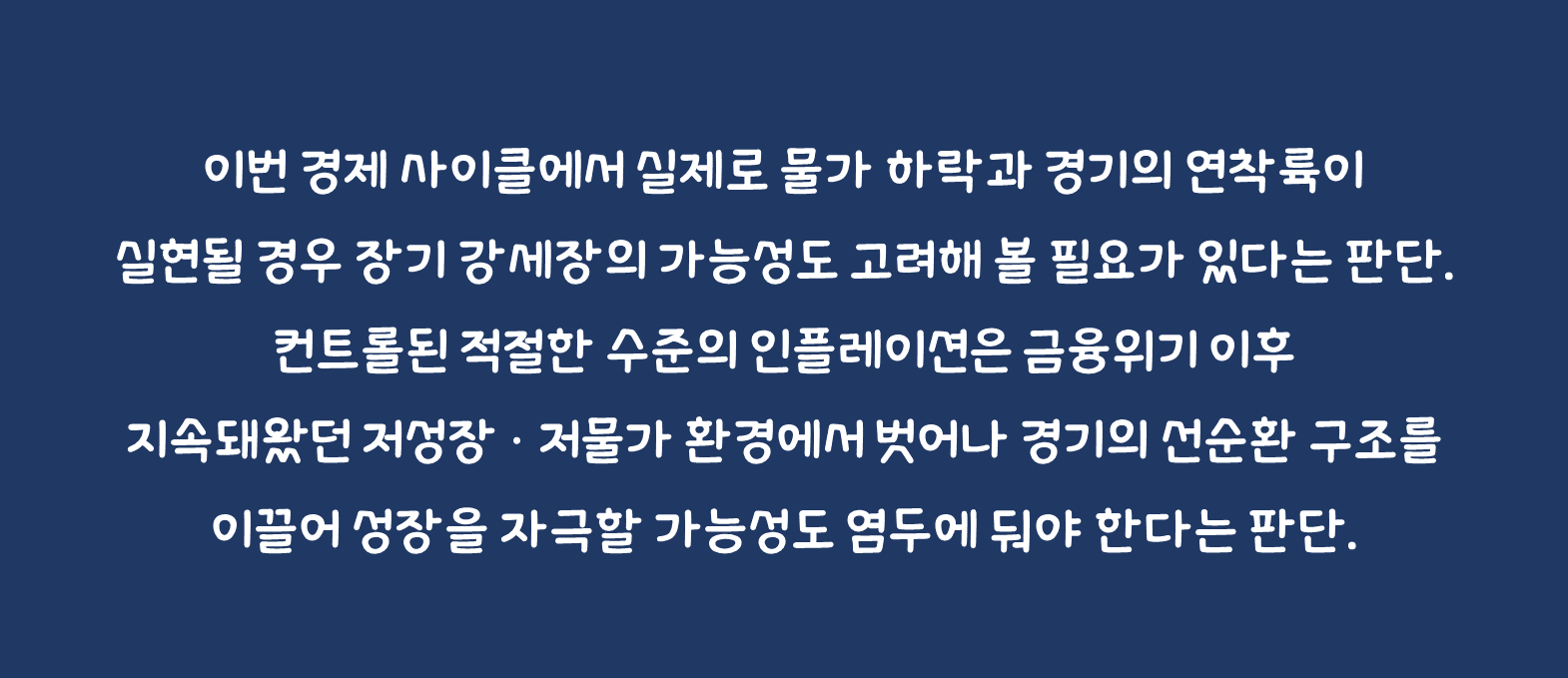 • 게다가 만약 이번 경제 사이클에서 실제로 물가 하락과 경기의 연착륙이 실현될 경우 장기 강세장의 가능성도 고려해 볼 필요가 있다는 판단. 왜냐하면 최근 우리가 3년 동안 겪었던 팬데믹 → 과잉 유동성 → 역사적 인플레이션 → 급격한 금리 인상 등 어느 하나 다루기가 쉬웠던 케이스가 없었다는 점에서 큰 부작용 없이 극복해낼 경우 금융시장에 대한 자신감이 강해질 것이기 때문. 또한 컨트롤된 적절한 수준의 인플레이션은 금융위기 이후 지속돼왔던 저성장·저물가 환경에서 벗어나 경기의 선순환 구조를 이끌어 성장을 자극할 가능성도 염두에 둬야 한다는 판단.