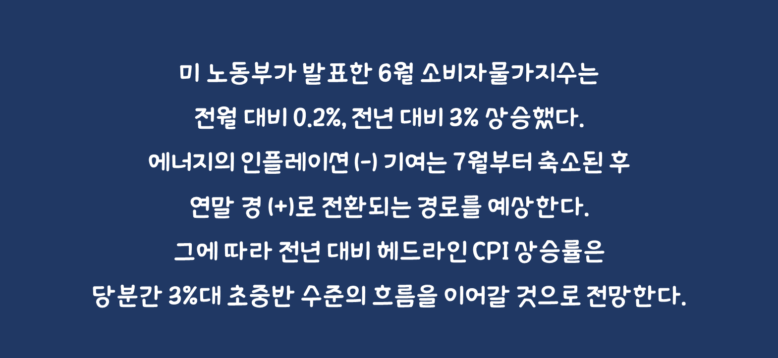 미 노동부가 발표한 6월 소비자물가지수는 전월 대비 0.2%, 전년 대비 3% 상승했다. 기저효과 덕분에 6월 전년 대비 헤드라인 CPI에 대한 에너지 항목의 기여도는 -1.5%p까지 늘었다. 상반기 중 에너지가 디스플레이션을 주도했으나 앞으로 그 힘은 약해진다. 에너지의 인플레이션 (-) 기여는 7월부터 축소된 후 연말 경 (+)로 전환되는 경로를 예상한다. 그에 따라 전년 대비 헤드라인 CPI 상승률은 당분간 3%대 초중반 수준의 흐름을 이어갈 것으로 전망한다.