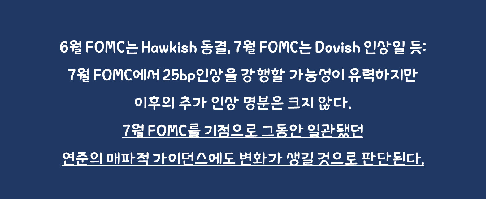 6월 소비자물가 보고서가 시시한 바와 같이 향후 인플레이션 위험은 크게 줄어들 것이다. 연준이 주목하는 주거비 제외 서비스 항목인 슈퍼코어 인플레이션은 전월 대비 연율로 1.1%까지 떨어졌다. 그럼에도 연준은 7월 FOMC에서 25bp인상을 강행할 가능성이 유력하지만 이후의 추가 인상 명분은 크지 않다. 7월 FOMC를 기점으로 그동안 일관됐던 연준의 매파적 가이던스에도 변화가 생길 것으로 판단된다.