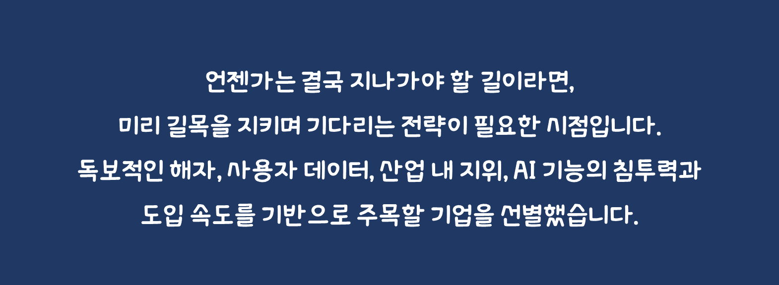 클라우드 산업 발달 초기에도 마이크로소프트와 아마존 같은 인프라 기업이 주목받았으나, 결국 가장 높은 주가상승률을 기록한 것은 SaaS(소프트웨어) 기업들이었습니다. 이번에도 유사할 가능성이 높습니다. 언젠가는 결국 지나가야 할 길이라면, 미리 길목을 지키며 기다리는 전략이 필요한 시점입니다. 독보적인 해자, 사용자 데이터, 산업 내 지위, AI 기능의 침투력과 도입 속도를 기반으로 주목할 기업을 선별했습니다. 앞으로 이어질 소프트웨어 기업의 생성 AI 모멘텀 투자에 도움받으시길 바랍니다.