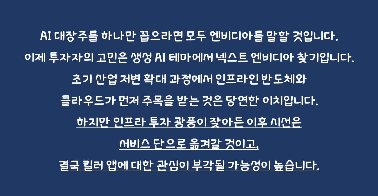 넥스트 엔비디아를 찾기 위해서는 생성 AI 전반의 사이클 이해가 필요합니다. 초기 산업 저변 확대 과정에서 인프라인 반도체와 클라우드가 먼저 주목을 받는 것은 당연한 이치입니다. 하지만 인프라 투자 광풍이 잦아든 이후 시선은 서비스 단으로 옮겨갈 것이고, 결국 킬러 앱에 대한 관심이 부각될 가능성이 높습니다.