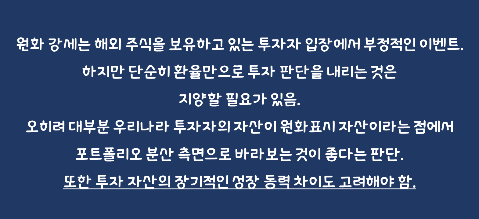 • 원화 강세는 해외 주식을 보유하고 있는 투자자 입장에서 부정적인 이벤트. 하지만 단순히 환율만으로 투자 판단을 내리는 것은 지양할 필요가 있음. 오히려 대부분 우리나라 투자자의 자산이 원화표시 자산이라는 점에서 포트폴리오 분산 측면으로 바라보는 것이 좋다는 판단. 또한 투자 자산의 장기적인 성장 동력 차이도 고려해야 함. 반대로 그동안 원화 약세에 따라서 해외주식 매수를 꺼렸던 투자자는 금번 원화 강세 흐름을 통해 해외자산의 비중을 늘릴 수 있는 기회로 삼아보는 것이 좋다는 판단.