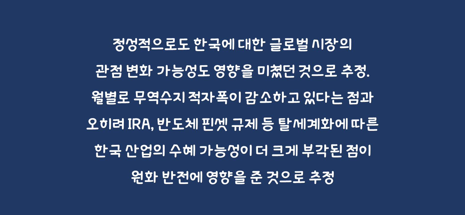 • 하지만 반도체 등 주력 수출품의 가격 회복 기대와 에너지 등 주요 수입품의 가격 하락이 이어지며 월별로 무역수지 적자폭이 감소하고 있다는 점과 오히려 IRA, 반도체 핀셋 규제 등 탈세계화에 따른 한국 산업의 수혜 가능성이 더 크게 부각된 점이 원화 반전에 영향을 준 것으로 추정.